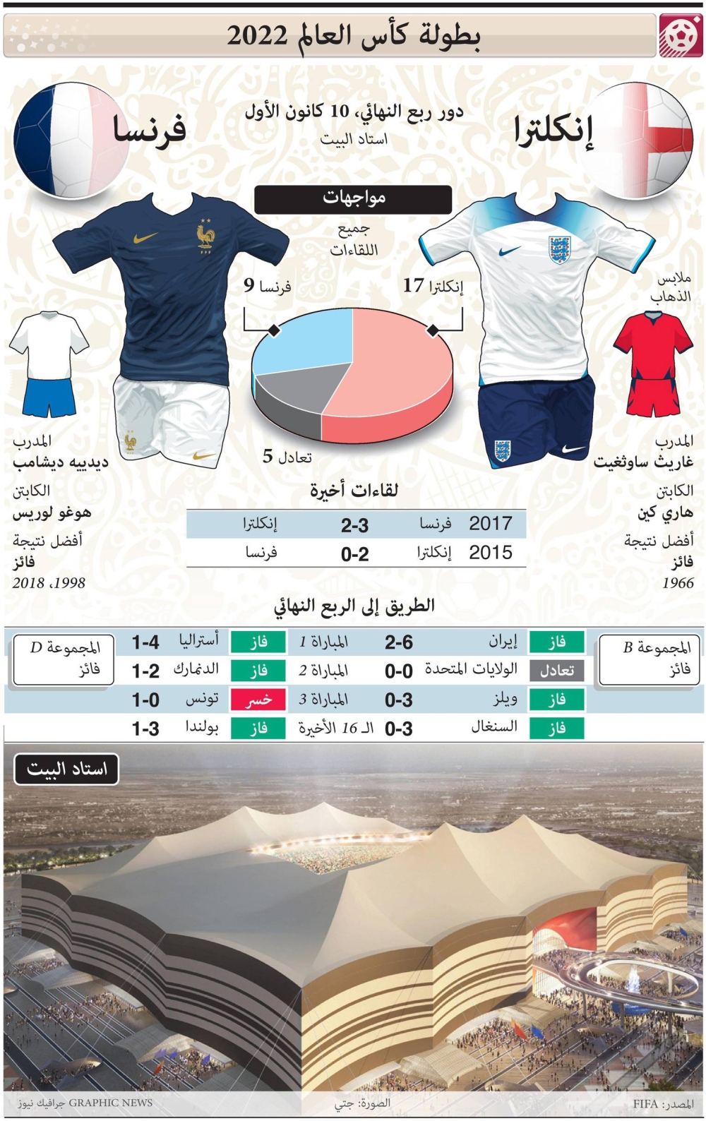 ستكون مواجهة الغد السبت الأولى بالأدوار الإقصائية في مسابقة كبيرة بين الجارين منتخب إنكلترا الملقب ب «الأسود الثلاثة» ونظيره منتخب «الديوك» الفرنسي في ربع نهائي مونديال قطر 2022 لكرة القدم.