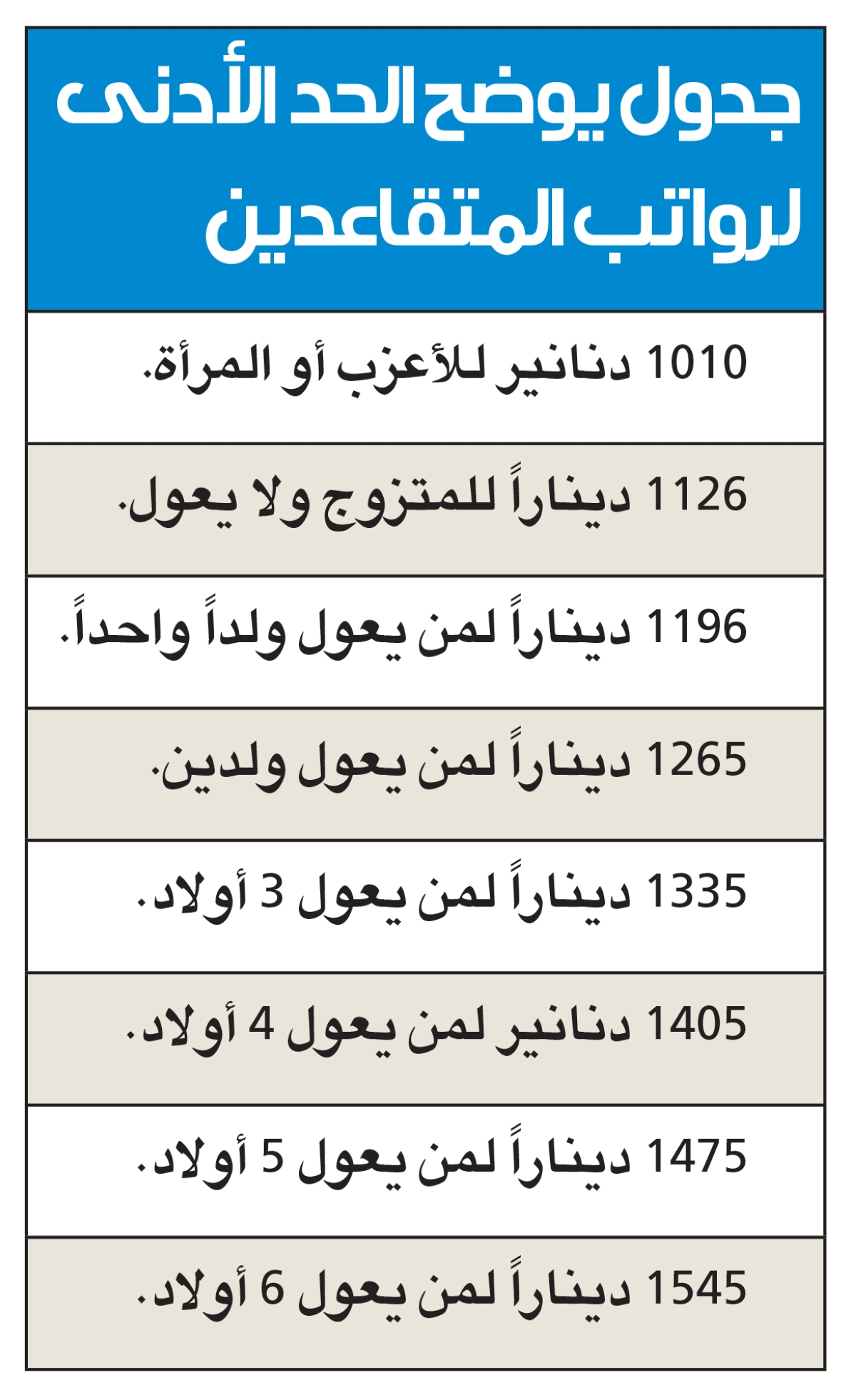 يُذكر أن القانون المعدل نص على أن ﯾﻛون اﻟﺣد اﻷدﻧﻰ ﻟﻠﻣﻌﺎش اﻟﺗﻘﺎﻋدي ﻟﻣن ﯾﻌول 7 أوﻻد أو أﻛﺛر 1615 دﯾﻧﺎراً ﺷهرﯾﺎً، وﯾﺻدر اﻟوزﯾر اﻟﻘرارات اﻟﻼزﻣﺔ ﻟﺑﻗية ﻓﺋﺎت اﻟﺣدود اﻟدﻧﯾﺎ، ﻋﻠﻰ أن ﯾﻛون اﻟﺣد اﻷدﻧﻰ ﻟﻔﺋﺔ (اﻣرأة/ أﻋزب) 1010 دﻧﺎنير ﺷهرﯾﺎ، وﺗﻛون اﻟﺣدود ﻟﻠﻣﺗزوج وﻻ ﯾﻌول 1126 دﯾﻧﺎراً ﺷهرﯾﺎً، وﻟﻣن ﯾﻌول وﻟداً واﺣداً 1196 دﯾﻧﺎراً ﺷهرﯾﺎً، وﻟﻣن ﯾﻌول وﻟدﯾن 1265، وﻟﻣن ﯾﻌول 3 أوﻻد 1335، وﻟﻣن ﯾﻌول 4 أوﻻد 1405، وﻟﻣن ﯾﻌول 5 أوﻻد 1475، وﻟﻣن ﯾﻌول 6 أوﻻد 1545 دﯾﻧﺎراً ﺷهرﯾﺎً.