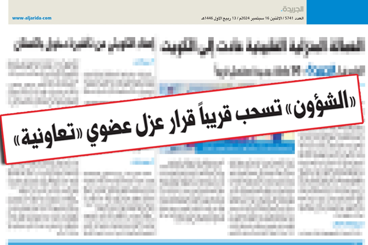 أعلنت وزارة الشؤون الاجتماعية، في بيان، رداً على خبر «الجريدة» المنشور في عددها الصادر، أمس، بعنوان («الشؤون» تسحب قريباً قرار عزل عضوي «تعاونية»)، إن «القرار الوزاري الصادر أخيراً بعزل عضوي مجلس إدارة إحدى الجمعيات التعاونية الواقعة في نطاق عمل محافظة حولي مايزال سارياً ولم يسحب، وذلك لثبوت التجاوزات والمخالفات التي نسبت إليهما».