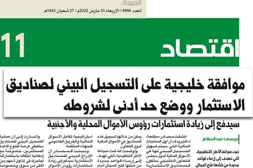 كشفت مصادر مطلعة لـ «الجريدة»، أن الصناديق الاستثمارية والريت أولى الأدوات الاستثمارية التي سيتم السماح لها بالتسويق والإدراج ضمن مشروع تسهيل الإدراج البيني للمنتجات المالية في دول مجلس التعاون الخليجي.