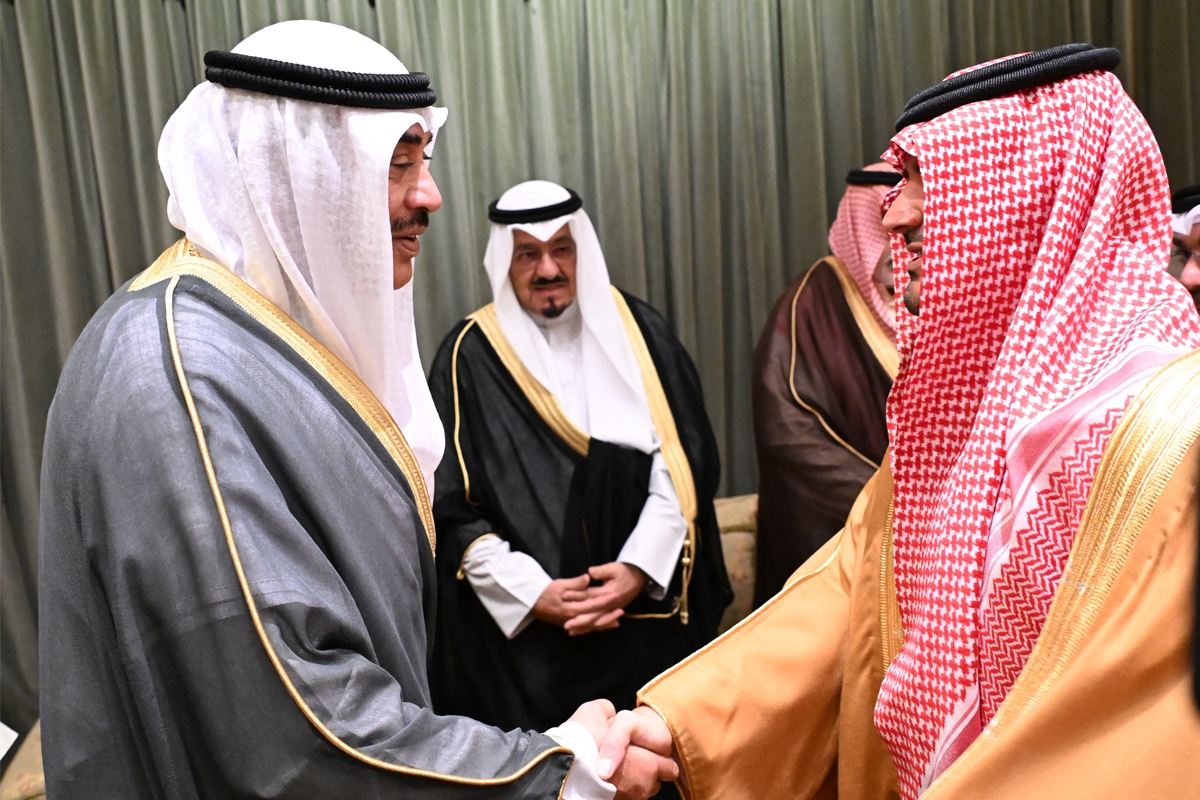 كما استقبل سمو ولي العهد، والشيوخ، وسمو رئيس مجلس الوزراء، وأسرة آل الصباح الكرام، ممثل رئيس دولة الإمارات العربية المتحدة الشقيقة، الشيخ محمد بن زايد، والشيخ حامد بن زايد، ووزير التسامح والتعايش، الشيخ نهيان بن مبارك، والوفد المرافق، حيث قدموا واجب العزاء بوفاة المغفور له بإذن الله تعالى سمو الشيخ جابر المبارك.