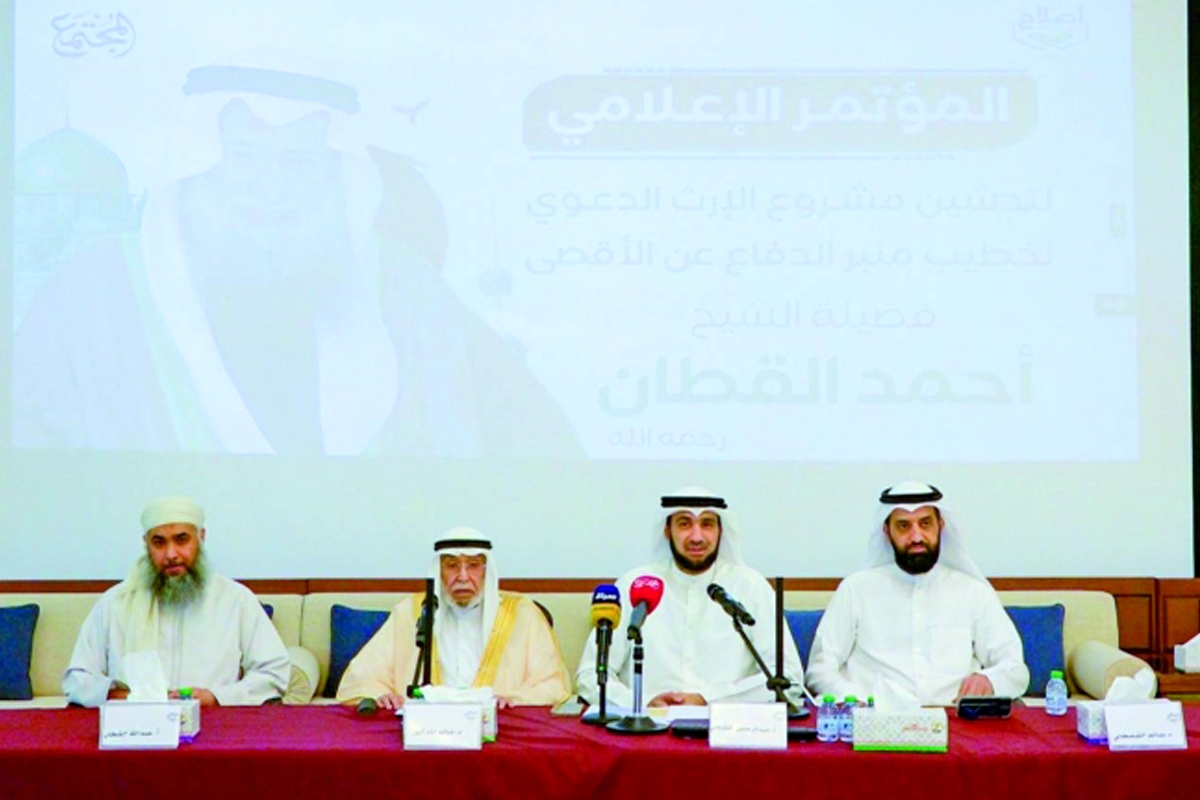 وعقدت الجمعية مؤتمراً صحافياً، أمس ، بمقرها لإعلان تدشين مشروع الإرث الدعوي للشيخ أحمد القطان، بحضور رئيس مجلس إدارة «الإصلاح» راعي المشروع د. خالد المذكور، ورئيس القطاع الإعلامي في الجمعية عبدالرحمن الشطي، ورئيس تحرير مجلة المجتمع د. سالم القحطاني، وممثل أسرة القطان عبدالله القطان.