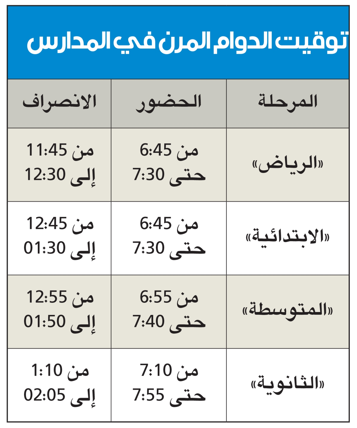 إلى ذلك، ذكرت المصادر أن الوزارة ستعمد إلى تضمين النشرة الخاصة بالدوام المرن وضرورة تعاون المعلمين مع الإدارات المدرسية فيما يخص الجدول الدراسي، لافتة إلى أن تطبيق «المرن» يجب ألا يتعارض مع مصلحة العمل في المدارس وتطبيق الحصص الدراسية.