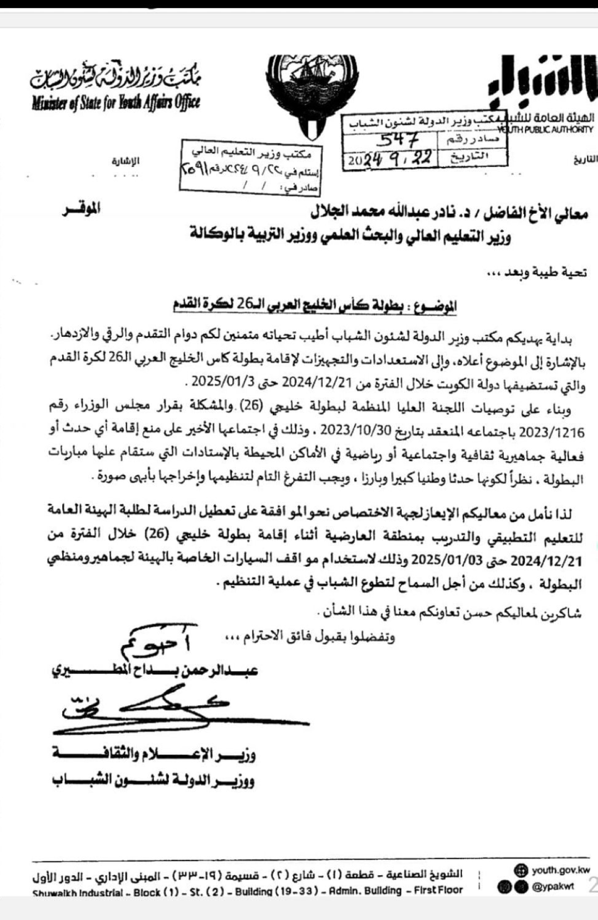 خاطب وزير الإعلام والثقافة وزير الدولة لشؤون الشباب عبدالرحمن المطيري نظيره وزير التعليم العالي والبحث العلمي والتربية بالوكالة د. نادر الجلال، بشأن تعطيل الدراسة لطلبة الهيئة العامة للتعليم التطبيقي بمنطقة العارضية بغرض تهيئة الأمور لتنظيم بطولة «خليجي 26» التي ستقام في الكويت اعتبارا من 21 ديسمبر المقبل حتى الثالث من يناير 2025.