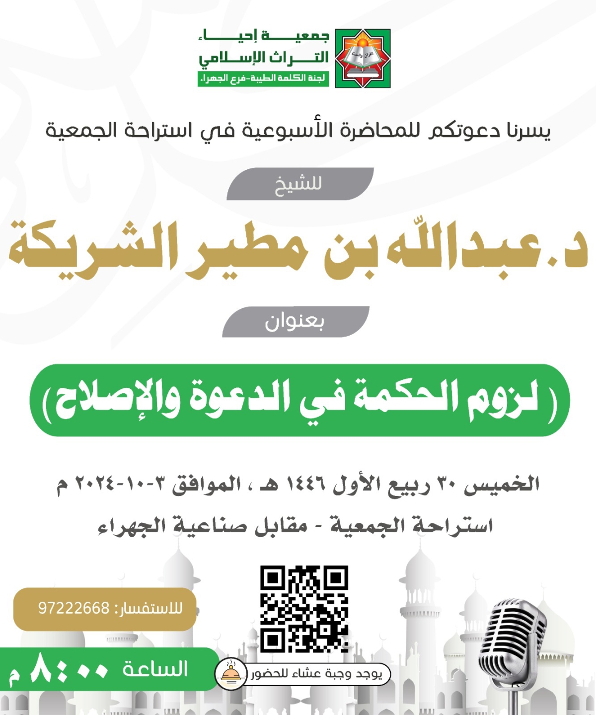 وأشارت الجمعية، في بيان، إلى تنظيم محاضرة بعنوان «لزوم الحكمة في الدعوة والإصلاح» يلقيها الشيخ د. عبدالله الشريكة مساء الغد باستراحة الجمعية مقابل صناعية الجهراء، ويشرف عليها فرع الجمعية في منطقة الجهراء.