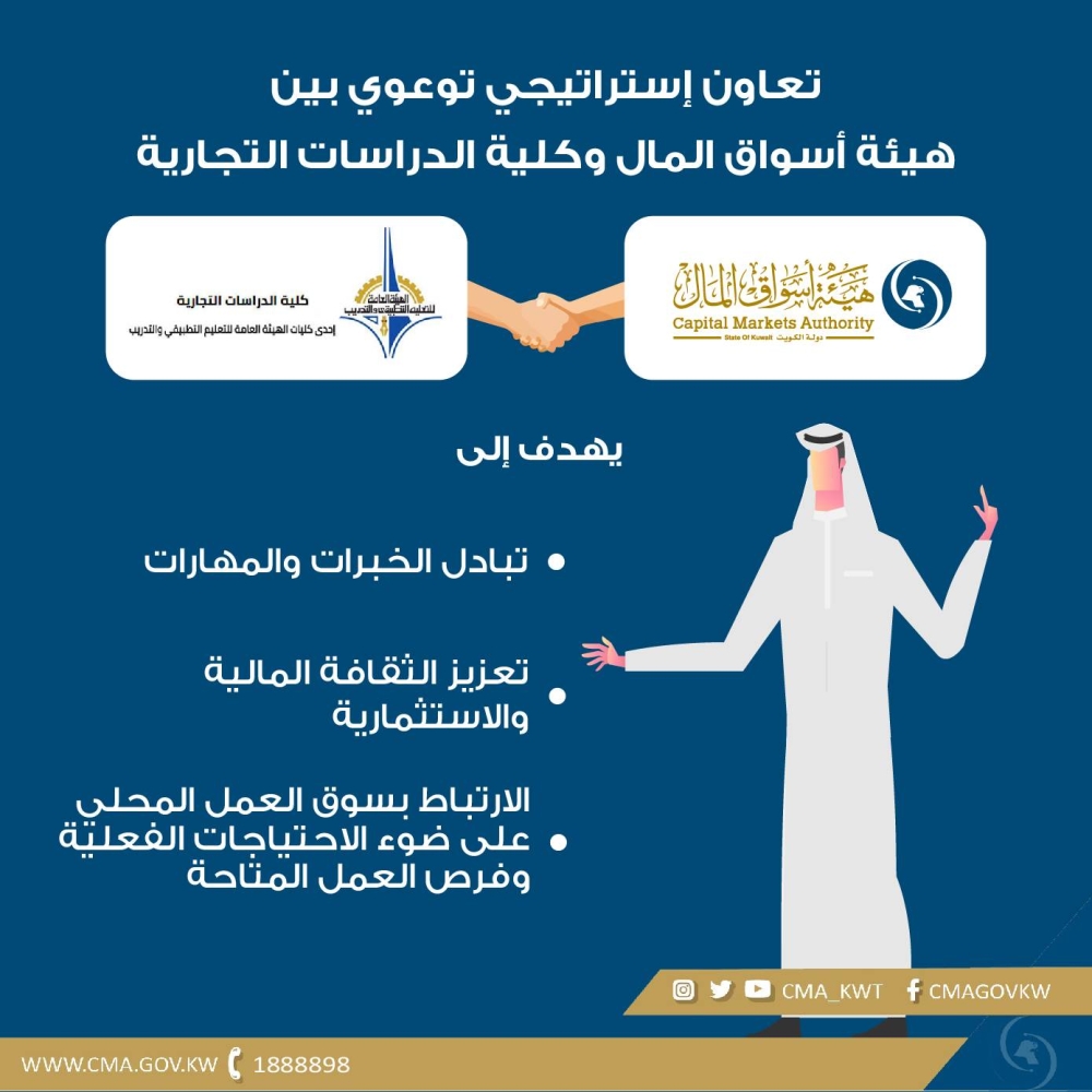 تنفيذاً لتوجهات التعاون الاستراتيجي التوعوي المشترك بين هيئة أسواق المال وكلية الدراسات التجارية، والتي تم الإعداد لها برعاية د. أحمد الملحم رئيس مجلس مفوضي هيئة أسواق المال ومديرها التنفيذي، ود. أحمد الحنيان عميد «الدراسات التجارية»، قامت هيئة أسواق المال في 5 الجاري بتنفيذ ورشتين توعويتين في مقر الكلية، مثلتا أولى فعاليات البرامج التوعوية المتنوعة واسعة النطاق التي يزمع الطرفان تنفيذها تباعاً.