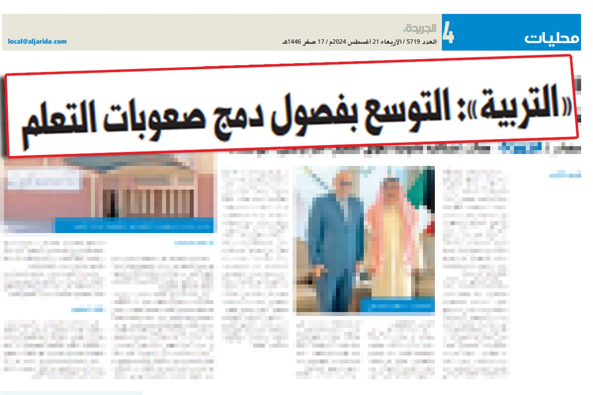 تأكيداً لخبر «الجريدة» في عددها بتاريخ 21 أغسطس الماضي، تعمل الجهات المختصة في وزارة التربية على الانتهاء من دراسة قدمتها منطقة العاصمة التعليمية، بشأن التوسع في الفصول الخاصة بطلبة الدمج للاعاقات البسيطة.
