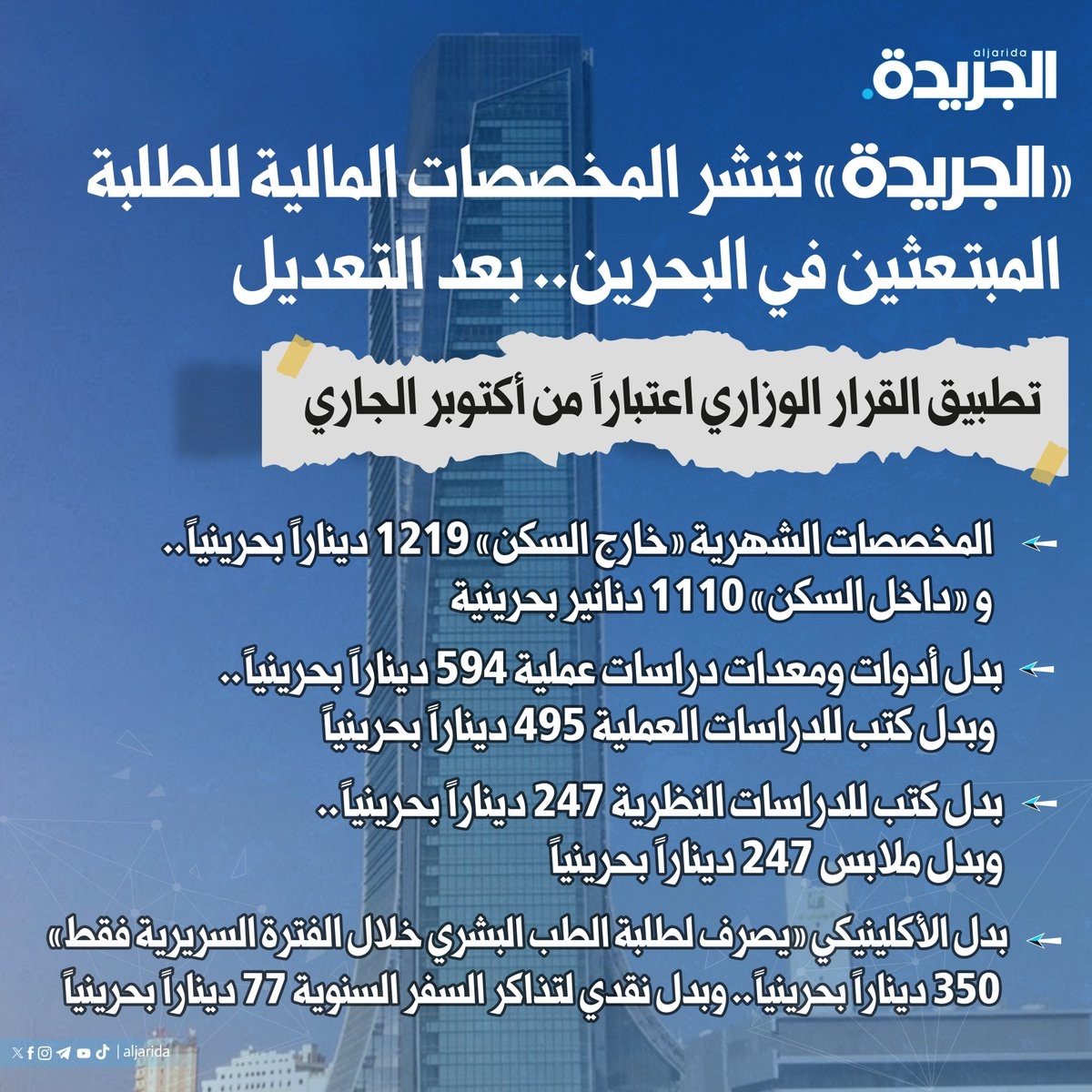 وقال المكتب، في التعميم الصادر مؤخرا، والذي حصلت «الجريدة» على نسخة منه، إن البيان التفصلي بالدينار البحريني، جاء كالتالي: «المخصصات الشهرية (خارج السكن) 1219 دينارا بحرينيا، و(داخل السكن) 1110 دنانير بحرينية، وبدل أدوات ومعدات دراسات عملية 594 دينارا بحرينيا، وبدل كتب للدراسات العملية 495 دينارا بحرينيا، وبدل كتب للدراسات النظرية 247 دينارا بحرينيا، وبدل الملابس 247 دينارا بحرينيا، وبدل الأكلينيكي (يصرف لطلبة الطب البشري خلال الفترة السريرية فقط) 350 دينارا بحرينيا، والبدل النقدي لتذاكر السفر السنوية 77 دينارا بحرينيا».