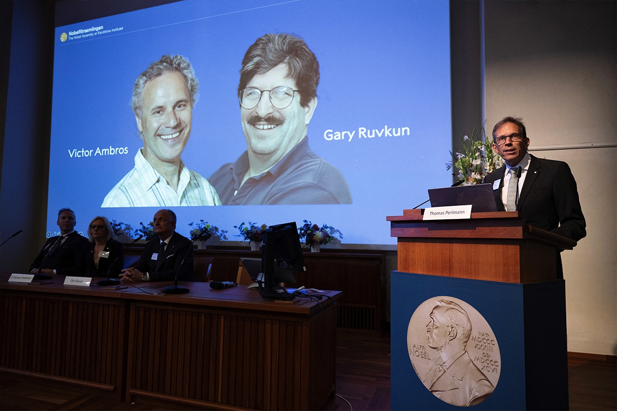 أعلن معهد كارولينسكا السويدي، أمس، فوز العالمين الأميركيين فيكتور أمبروس الذي يعمل في كلية الطب بجامعة ماساتشوستس وغاري روفكون الذي يعمل في كلية الطب بجامعة هارفارد ومستشفى ماساتشوستس العام بجائزة نوبل في الطب لهذا العام، لاكتشافهما جزيئات الحمض الريبوزي النووي الميكروي (آر إن إيه) المتناهية الصغر التي تقوم بدور مهم في تنظيم الجينات.