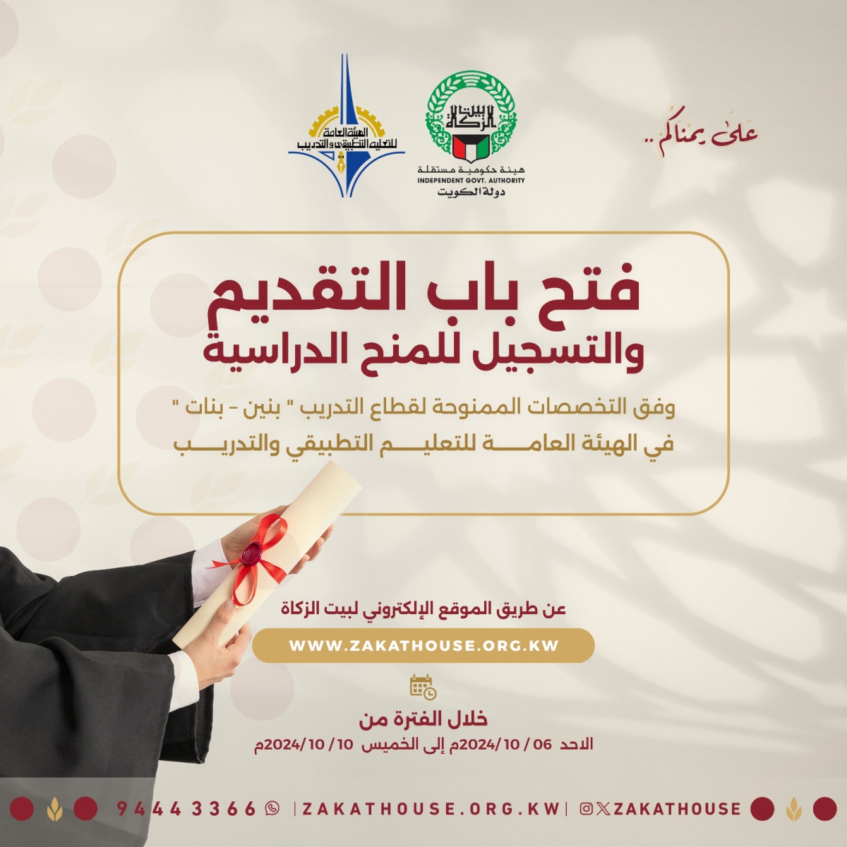 أعلن بيت الزكاة فتح باب التقديم للمنح الدراسية للحالات المسجلة لديه للعام الدراسي (2024 – 2025) وفق التخصصات الممنوحة لقطاع التدريب بنين وبنات في الهيئة العامة للتعليم التطبيقي والتدريب عن طريق التسجيل في الموقع الالكتروني للبيت خلال الفترة من الأحد 6 إلى الخميس 10 الجاري، وفق ضوابط وشروط خاصة في بيت الزكاة ليتم لاحقاً ترشيحهم لعمادة شؤون الطلبة بالهيئة.
