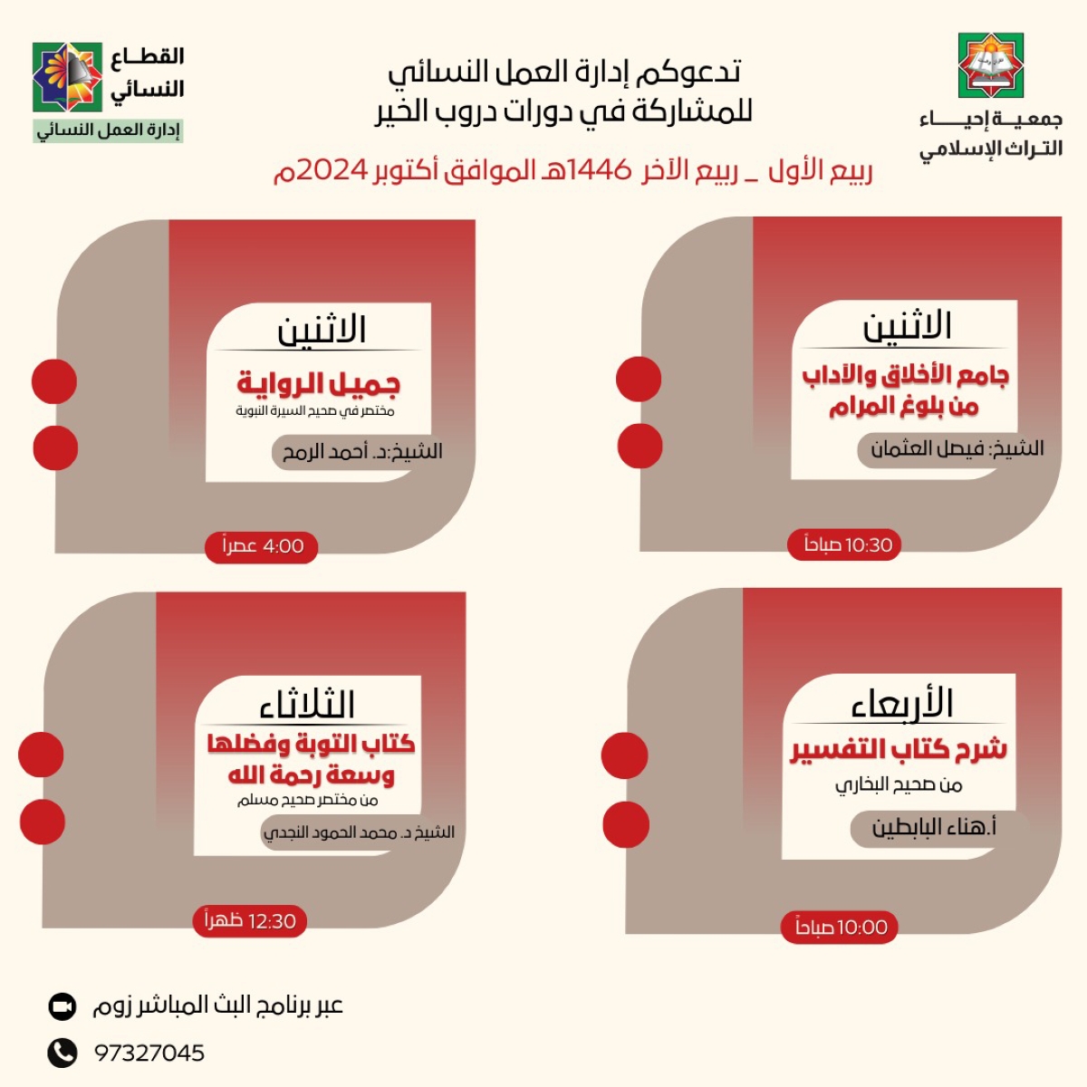 أعلنت إدارة العمل النسائي بالقطاع النسائي في جمعية إحياء التراث الاسلامي، طرح برنامج دورات علمية وثقافية خلال اكتوبر الجاري.