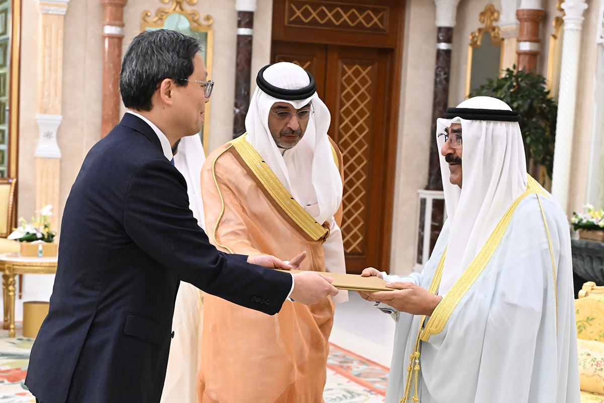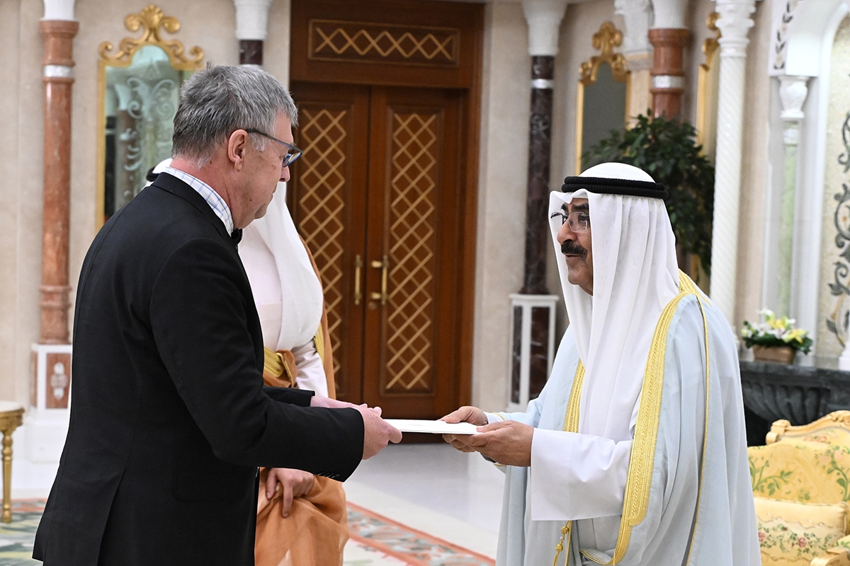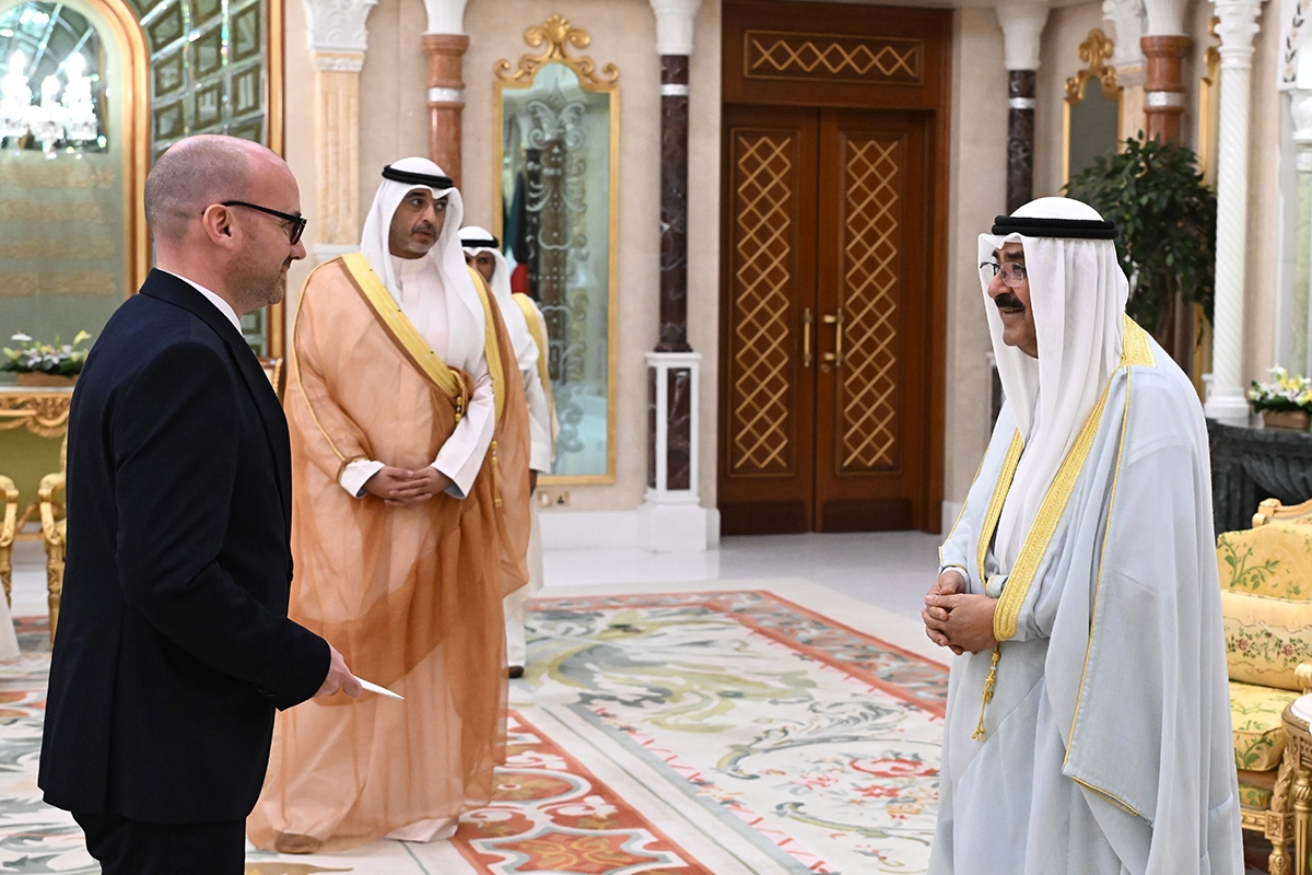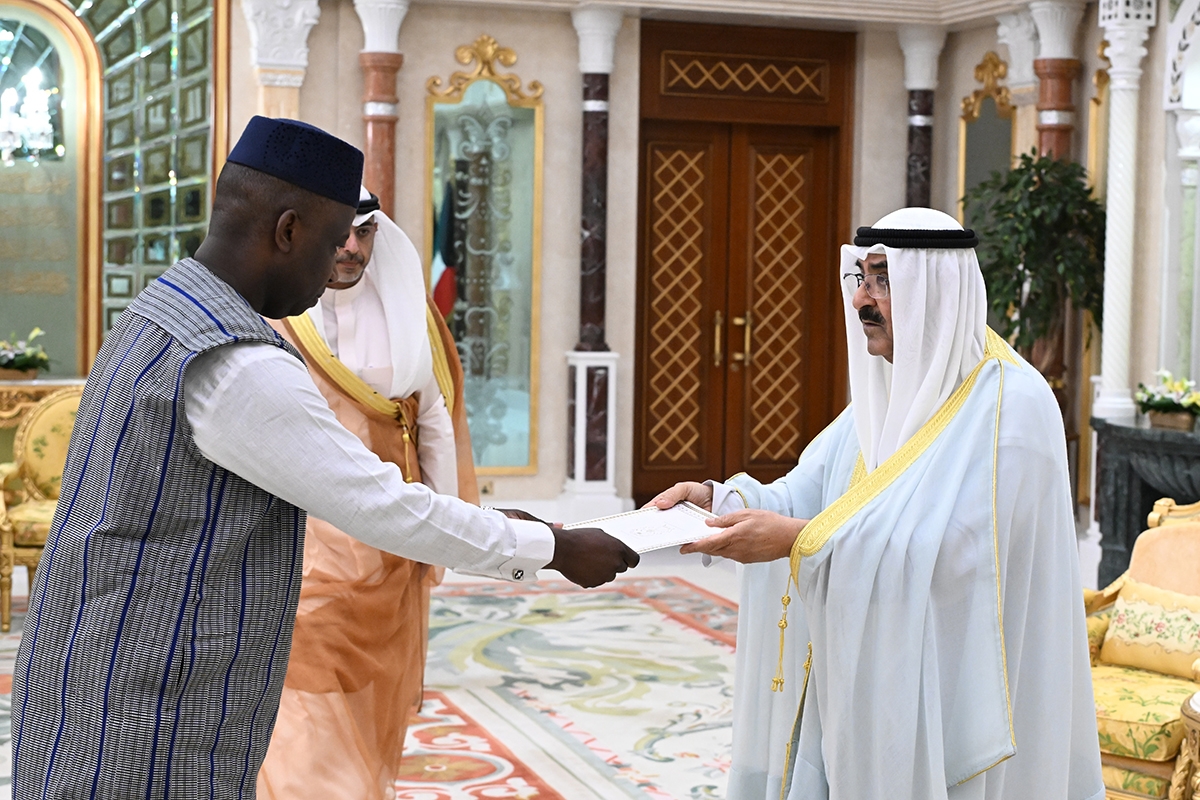احتفل في قصر بيان، صباح اليوم ، بتسلم صاحب السمو أمير البلاد الشيخ مشعل الأحمد أوراق اعتماد كل من بارك تشونغ سوك سفيراً لجمهورية كوريا، ويواري خميل سفيراً لجمهورية التشيك، ومانويل إرنانديث غمايو سفيراً لمملكة إسبانيا، والدكتور عبدالله محمد شيخ عبدالله سفيراً لجمهورية الصومال الفيدرالية، وأوليفير غوفين سفيراً للجمهورية الفرنسية، وحسن تامبورا سفيراً لبوركينا فاسو، وذلك سفراء لبلادهم لدى الكويت.