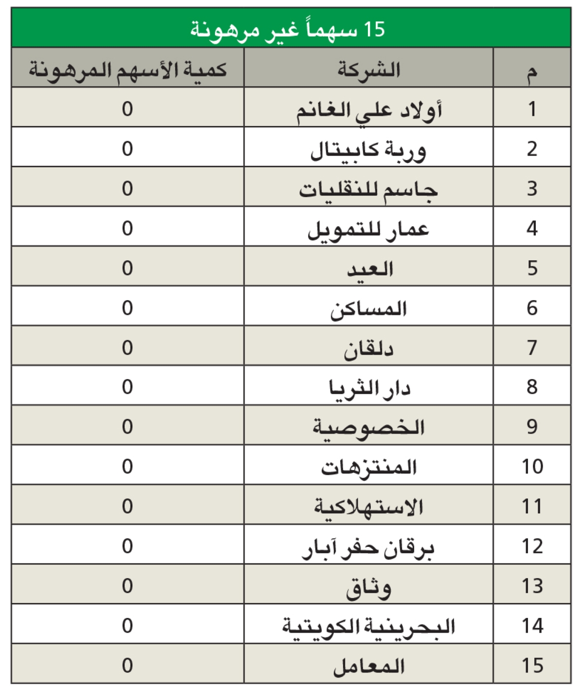 15 سهماً مدرجة نسبة رهنها مقابل التمويل... صفر