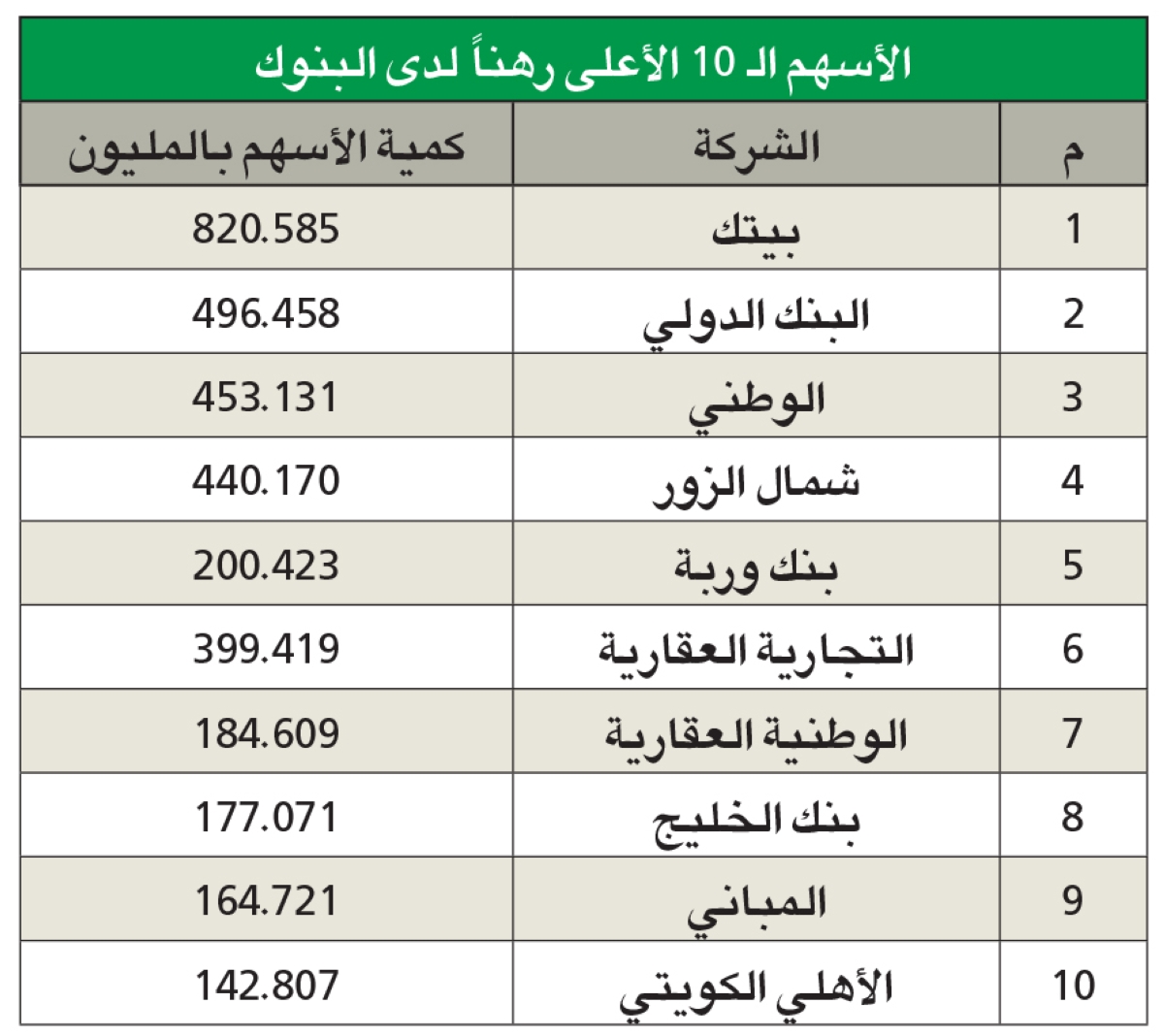في سياق متصل، وفي مؤشر آخر على قوة أسهم البنوك واعتمادها على قائمة الأصول المرحب بها كرهن، سيطرت الأسهم المصرفية ضمن قائمة أعلى 10 أسهم مرهونة على نسبة تبلغ نحو 60 في المئة، إذ جاء في القائمة 6 أسهم بنوك مقابل 3 شركات عقارية وشركة خدمات.