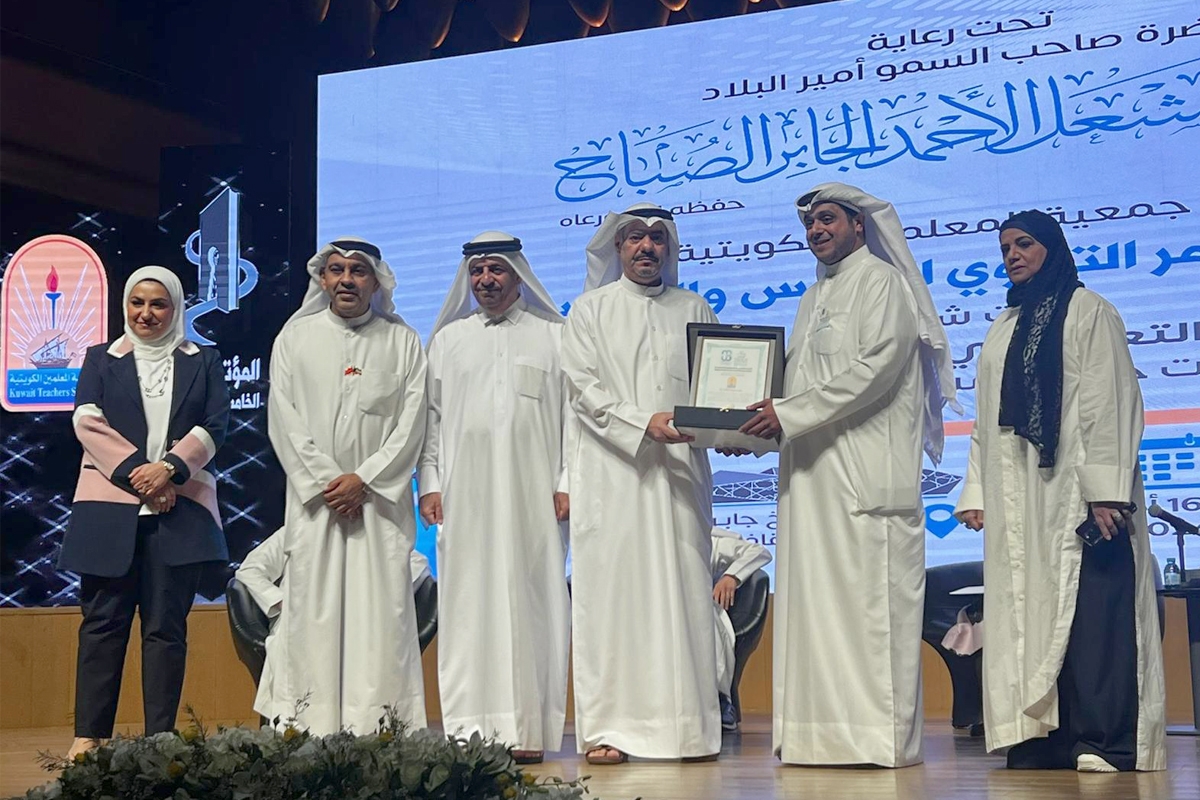 سلم السفير الأممي للشراكة المجتمعية حمد البسيس علامة «المؤسسة المسؤولة مجتمعياً والشهادة الدولية» لرئيس جمعية المعلمين حمد الهولي، خلال فعاليات «المؤتمر التربوي الخامس والأربعين» الذي نظمته الجمعية في الفترة بين 14 و16 الجاري.