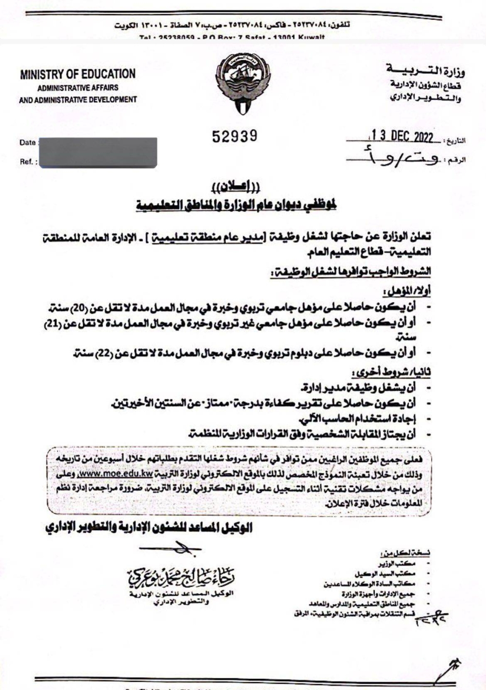 في هذا السياق، أعلنت وزارة التربية عن حاجتها لشغل وظيفة مدير عام منطقة تعليمية، على أن يكون المتقدم حاصلاً على مؤهل جامعي تربوي وخبرة في مجال العمل لا تقل عن 20 عاما، أو أن يكون المتقدم حاصلاً على مؤهل جامعي غير تربوي وخبرة في مجال العمل لا تقل عن 21 سنة، أو أن يكون حاصلاً على دبلوم تربوي في مجال العمل مدة لا تقل عن 22 سنة، على أن يكون المتقدم قد شغل وظيفة مدير إدارة، وحاصلاً على تقرير كفاءة بدرجة امتياز عن السنتين الأخيرتين، مع إجادة استخدام الحاسب الآلي واجتياز المقابلة الشخصية، وفق القرارات الوزارية المنظمة، كما أعلنت الوزارة فتح الباب للترشح لوظيفة مدير الإدارة العامة للتعليم الخاص، بنفس الشروط.