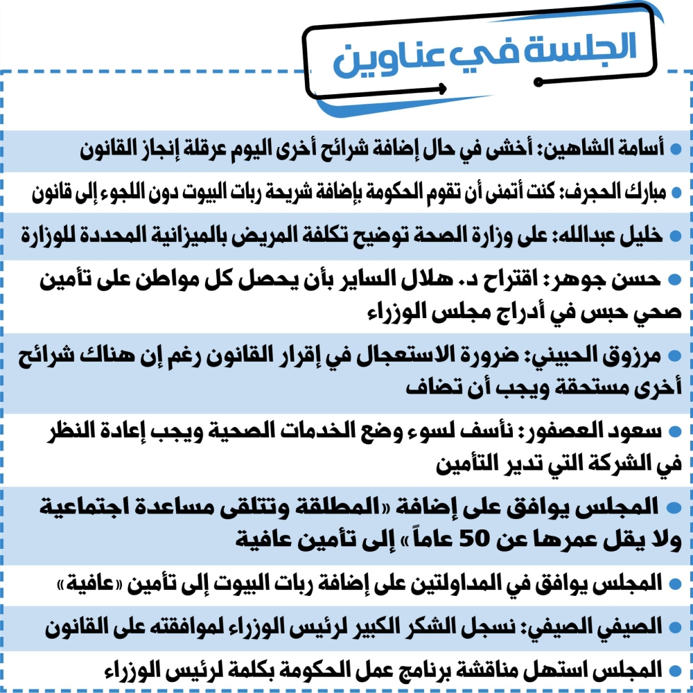 • أقر في المداولتين إضافة ربات البيوت والمطلقات إلى تأمين «عافية».