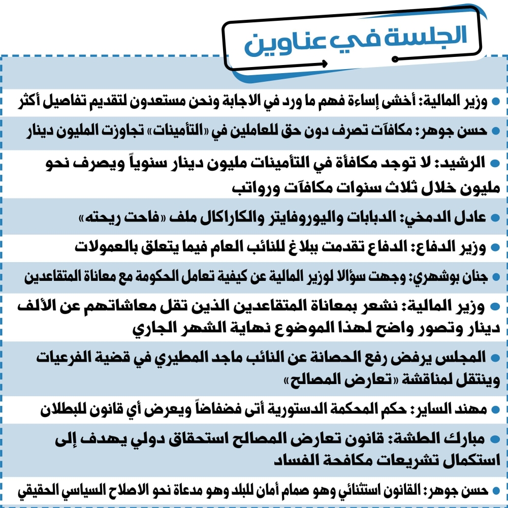 ورد وزير المالية على جوهر: شكرا لك على حرصك، وأود أن أقول إن هناك إجراءات إصلاحية وحوكمة التأمينات، أولها معالجة موضوع الملفات، وتعهدنا بقرار بأن مكافآت أعضاء مجالس الإدارات ستوزع من خلال صندوق بالتساوي، وليس كما كان سائدا سابقا، وأصدرت قرارا بلجنة الاستثمار وعودتها للوزير، وسيتم تشكيل مجلس إدارة جديد ولجنة استثمار وآلية جديدة للتعامل في التأمينات وفي الشركات والصناديق التابعة للمؤسسة وتشكيل لجنة تحقيق لمعالجة مخالفات المؤسسة المالية والإدارية، وأضم صوتي لجوهر وأتعاون معه في هذا الملف بشفافية، ولا توجد مكافأة في التأمينات تصل الى مليون دينار.