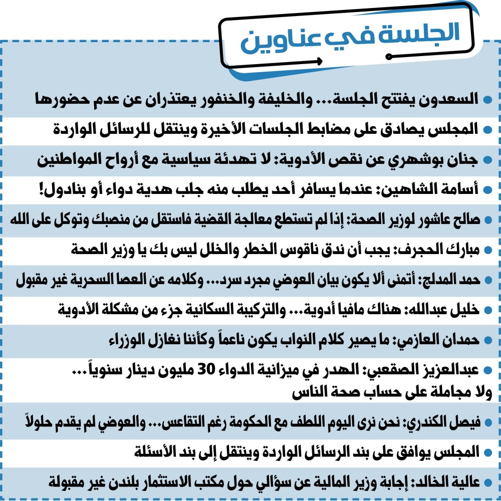 وكان أول المتحدثين في بند الرسائل الواردة النائبة جنان بوشهري، التي أكدت أنه «قبل أسابيع وقف وزير المالية على المنصة، وقال إن هناك وفرة مالية وفوائض، وفي المقابل هناك عجز كبير في الأدوية، واسأل وزير التجارة: أنت تاجر ماذا عن مخازن الأدوية؟ واسأل وزير الصحة ولد الوزارة ان هناك نقصا في الادوية وأنت رفضت استلام أدوية السرطان، وأقول يا وزير الشكوى ليست من المواطنين فحسب إنما من الدكاترة والأطباء، واسأل وزير الدولة لشؤون مجلس الوزراء ما وظيفتك في التنسيق بقضية الأدوية؟ واقول للعجمي والملا أنتما نائبان قبل أن تكونا وزيرين فهل تقبلان أن يحدث ذلك في العهد الجديد؟ اليوم نضع كل وزير أمام مسؤولياته في هذه القضية، وأنا على يقين بأن يتعامل مجلس الأمة مع رسالتي بكل مسؤولية، واليوم لا احد يقول لي محتاجين مواءمة وتهدئة سياسية لان القضية تعني أرواح المواطنين».