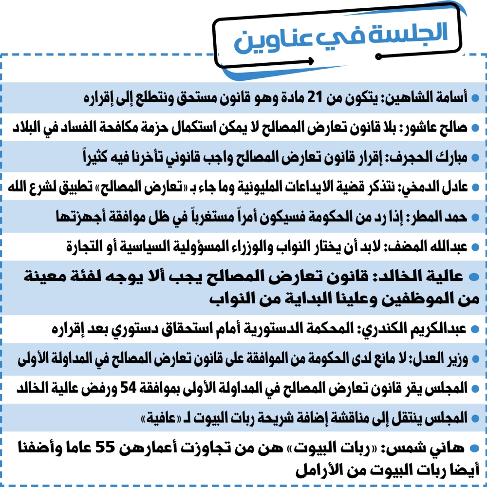ووافق المجلس على قانون تعارض المصالح في المداولة الأولى، من خلال حضور 55 عضوا، وموافقة 54، ورفض عضو واحد هي عالية الخالد.