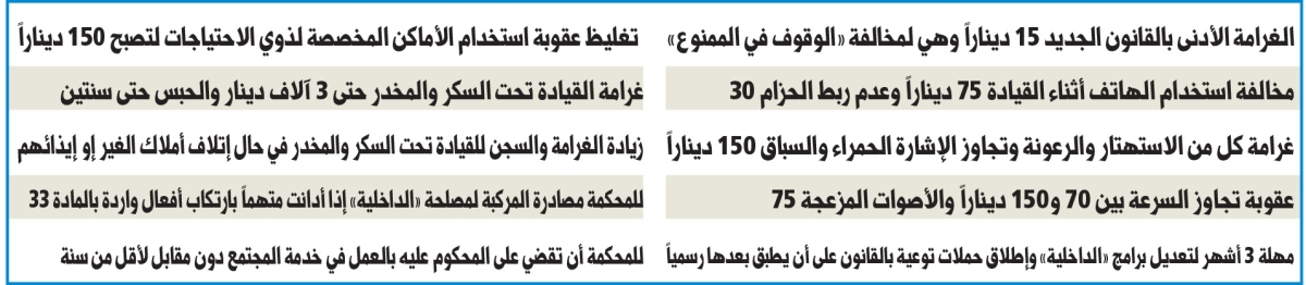 وذكر أنه يتم تسجيل نحو 300 حادث مروري يومياً في البلاد، 90 في المئة منها بسبب عدم الانتباه أو انشغال قائدي المركبات باستخدام الهاتف أو الاستهتار أو الرعونة، لذا فإن مخالفة استخدام الهاتف أثناء القيادة ستتضاعف في القانون الجديد من 5 دنانير إلى 75 دينارا، وعقوبة مخالفة عدم ربط حزام الأمان من 10 دنانير إلى 30.