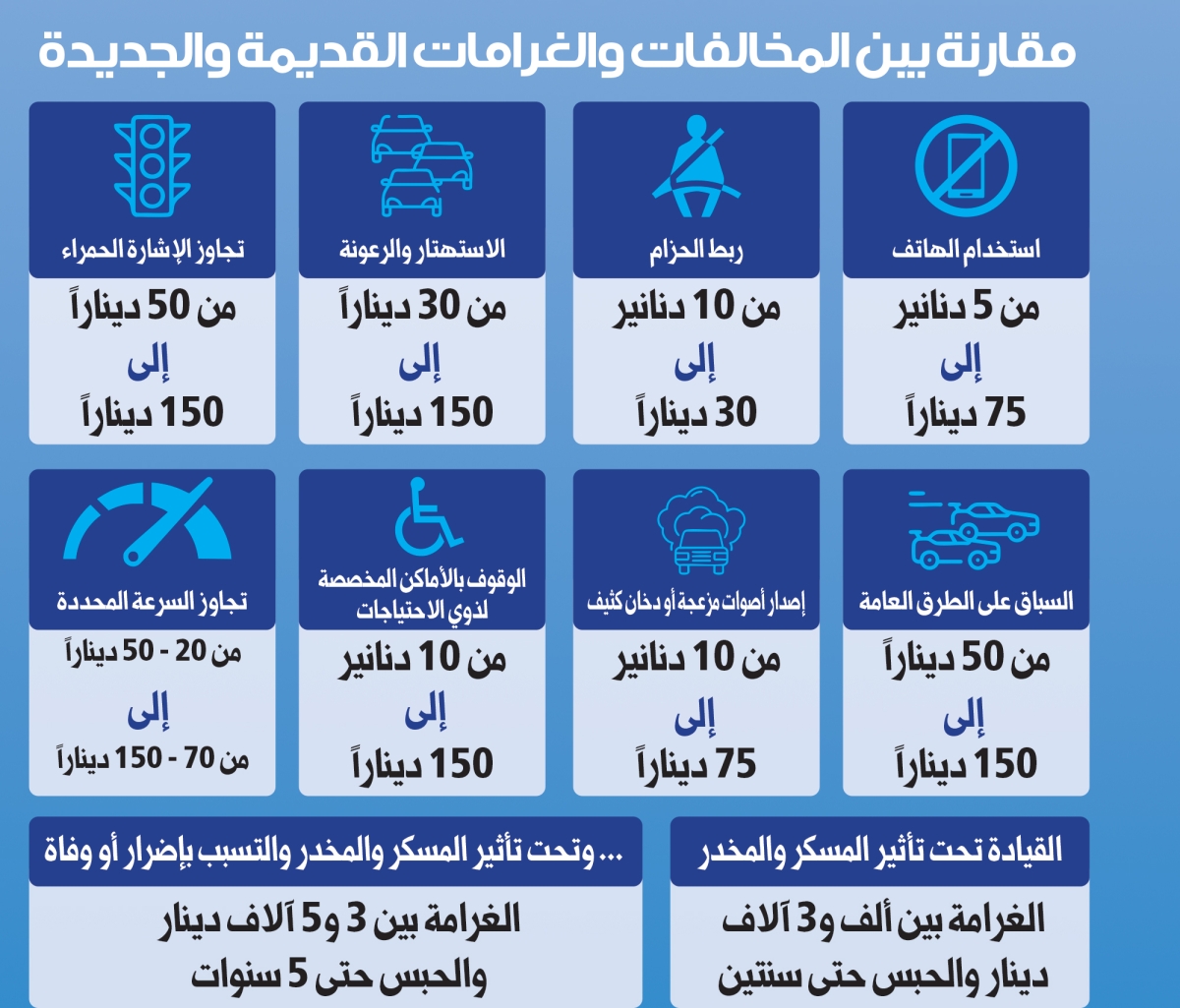 وأضاف أن الغرامات الأخرى قفزت بين 3 أضعاف و15 ضعفاً حسب نوعها، إذ ارتفعت عقوبة استخدام الهاتف أثناء القيادة 15 مرة إلى 75 ديناراً، وعدم ربط الحزام 3 مرات إلى 30 ديناراً، فضلاً عن وصول غرامة الاستهتار والرعونة إلى 150 ديناراً بزيادة 5 أضعاف، وكذلك غرامة تجاوز الإشارة الحمراء إلى 150 بارتفاع 3 أضعاف، وهو نفس الأمر بالنسبة إلى السباق على الطرق العامة.