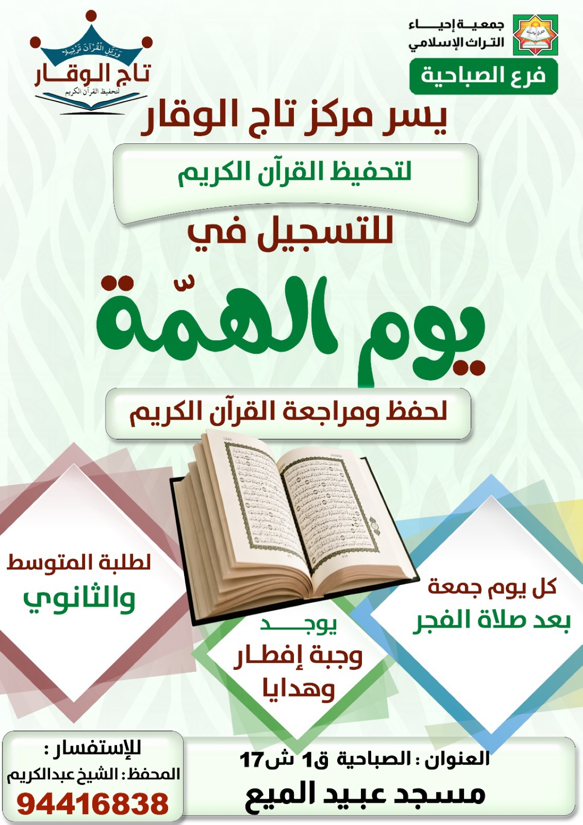 تنظم جمعية إحياء التراث الإسلامي العديد من حلقات تحفيظ القرآن الكريم التي يتم فيها تدريس التجويد والتفسير وتصحيح التلاوة، ومن ذلك فتح باب التسجيل في حلقة لحفظ ومراجعة القرآن الكريم لطلبة المرحلتين المتوسطة والثانوية تحت شعار «يوم الهمة»، التي يشرف عليها مركز تاج الوقار لتحفيظ القرآن الكريم الصباحية.
