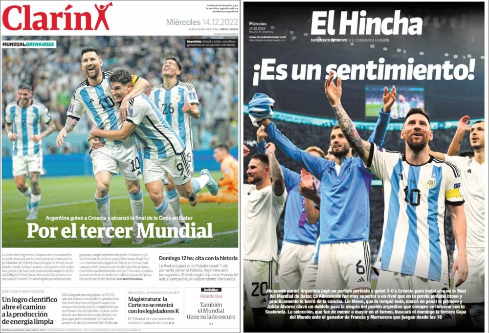 وكتبت «لا ناسيون»، في نسختها على الإنترنت، «الأرجنتين في نهائي كأس العالم! تألقت مع ميسي الرائع وتنتظر منافسها الأحد»، وشددت على «الأداء البارع» الذي قدمه ميسي صاحب الهدف الأول من ركلة جزاء (34) والتمريرة الحاسمة للهدف الثالث الذي سجله خوليان ألفاريز في الشوط الثاني (69).