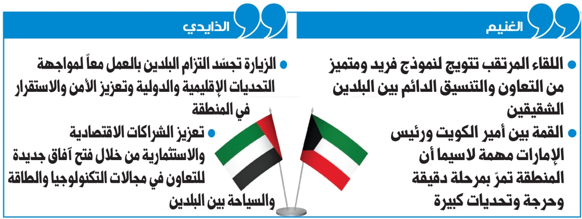 ووصف العلاقات الكويتية - الإماراتية بأنها نموذج يحتذى في إطار منظومة التعاون الخليجي والعربي المشترك، إذ تجمعنا رؤى مستقبلية مشتركة تهدف إلى تحقيق التنمية المستدامة وتحسين جودة حياة المواطنين، مستطردا: «وهنا تبرز أهمية هذه الزيارة في تعزيز الشراكات الاقتصادية والاستثمارية وتبادل الخبرات من خلال فتح آفاق جديدة للتعاون في مجالات التكنولوجيا الطاقة والسياحة».