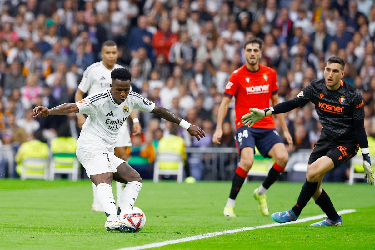 وأضاف فينيسيوس الثالث له «هاتريك»، رافعاً رصيده الى ثمانية اهداف في الدوري الإسباني بعد خطأ فادح من أحد مدافعي اوساسونا الذي تأخر في تشتيت الكرة، فانقض المغربي ابراهيم دياس على الكرة ومررها من دون أي انانية لفينيسيوس الذي صوّبها مباشرة داخل المرمى (69).