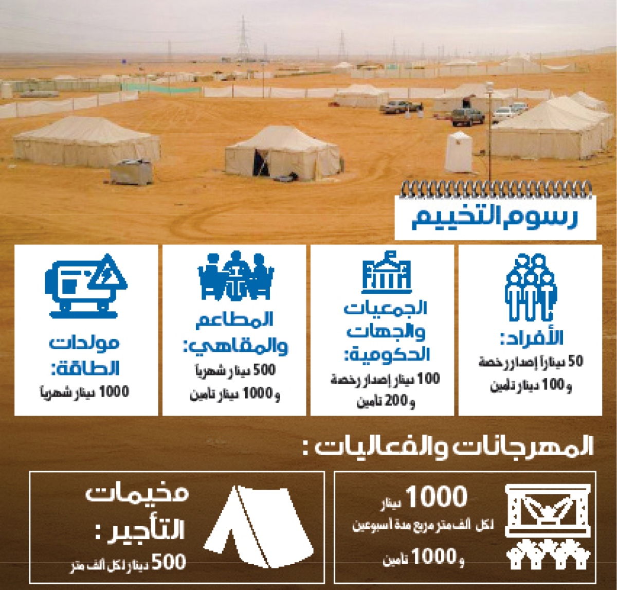 ومن أبرز التعديلات التي اعتمدها البلدي على مشروع اللائحة «تعديل رسوم الترخيص للجمعيات والجهات الحكومية وما في حكمها بدفع 100 دينار للرخصة غير مسترجعة، و200 دينار تأميناً، واستحداث مادة للسماح لشركات القطاع الخاص بتأجير المخيمات، والسماح لأصحاب المشاريع الصغيرة والمتوسطة والأنشطة الخاصة بإقامة المخيمات البرية، بإصدار رخصة تأجير مخيمات على أن تكون الرسوم 500 دينار على كل 1000 متر، بحيث يسمح بإقامتها بمساحة 5 في المئة من المساحة الإجمالية المخصصة للتخييم، وتتضمن أنشطة تجارية وترفيهية داخل حدود الموقع، مع السماح بترخيص مواقع لمولدات الطاقة برسوم 1000 دينار شهرياً».