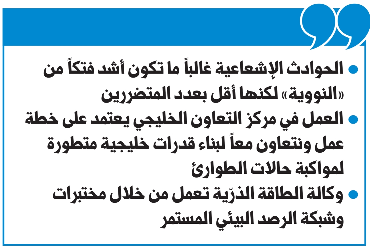 - العمل في مركز التعاون الخليجي هو خطة عمل أكثر من خطة مواجهة، لأن الخطط تتم عادة من خلال مستوى الدول، ويكون فيها توافق وتكامل بين الدول، ونحن عندما نتحدث عن المركز فهو معنيّ بكل حالات الطوارئ، ونحن في هذا الصدد نتحدث في وكالة الطاقة الذرية عن الطوارئ النووية الإشعاعية التي لها خصوصية في حالات حدوثها ومجالاتها والتعاطي معها.