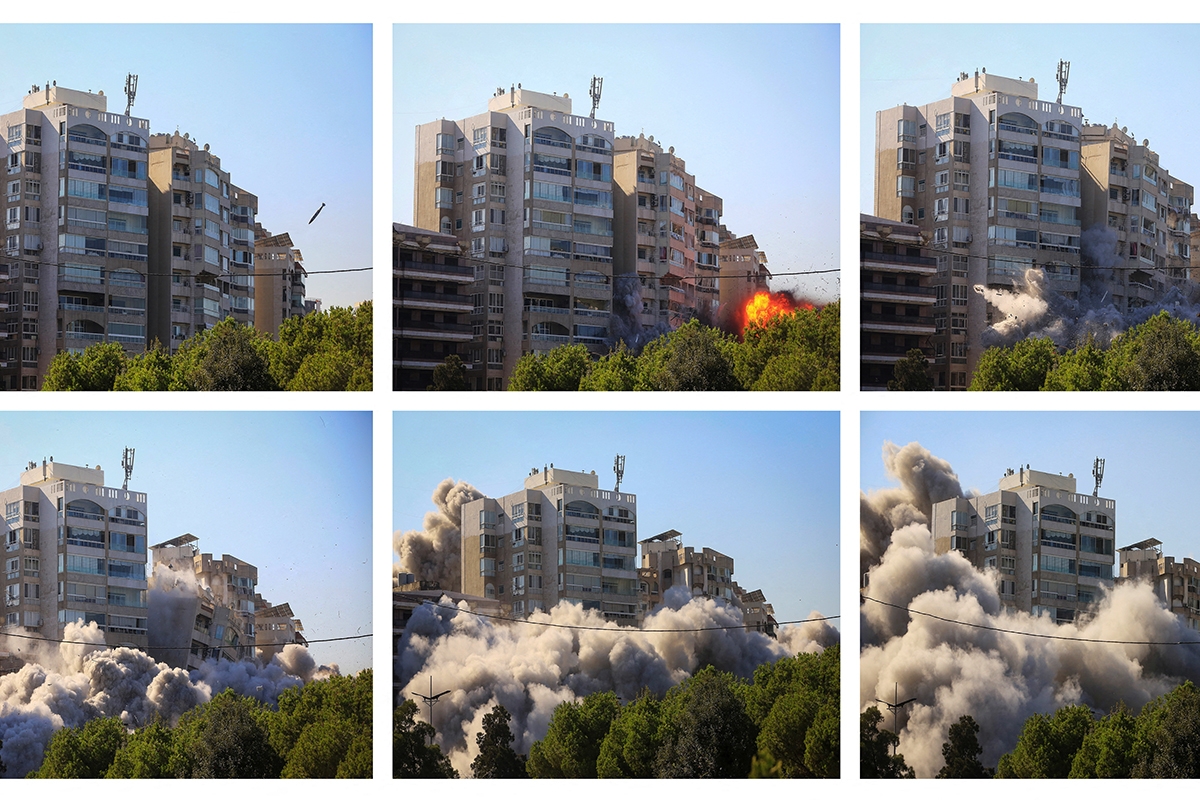 وأظهرت عدة صور التقطها مصوّر «فرانس برس» مقذوفاً يضرب الطوابق السفلية للمبنى ما أدى إلى اندلاع النيران وانهيار المبنى وسط سحابة من الدخان.