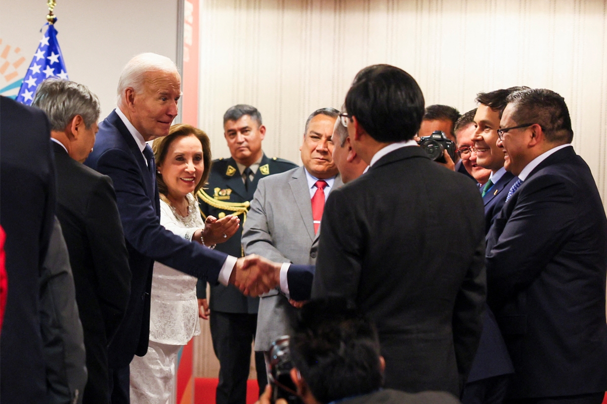 وفي حين اتسم استقبال بايدن الخميس بالتكتم مع صفين من عدد ضئيل من الجنود في المطار، التقته الرئيسة دينا بولوارتي شي في القصر الحكومي في ليما، وعزفت فرقة نحاسية باللباس الاحتفالي الأزرق والأحمر والقبعات المزدانة بالريش لدى وصوله.