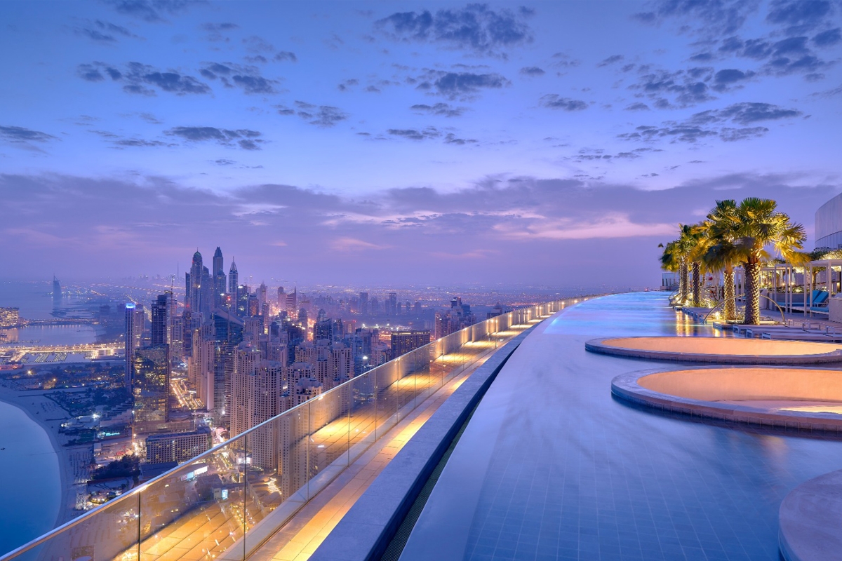 تنضوي «أورا سكاي بول» تحت محفظة مجموعة صن سيت للضيافة، وتُعد أول وأعلى حوض سباحة بانورامي والأكثر ارتفاعاً في العالم على ارتفاع 200 متر، وتتميز بإطلالات بانورامية مذهلة لأشهر معالم دبي تتضمن نخلة الجميرا وبرج العرب وبرج خليفة وعين دبي، وتتوفر هناك مصاعد خاصة تنقل الضيوف إلى جزيرة مميزة في الطابق 50 من برج ذا بالم تاور تحظى بإطلالات خلابة على أفق دبي الساحر.