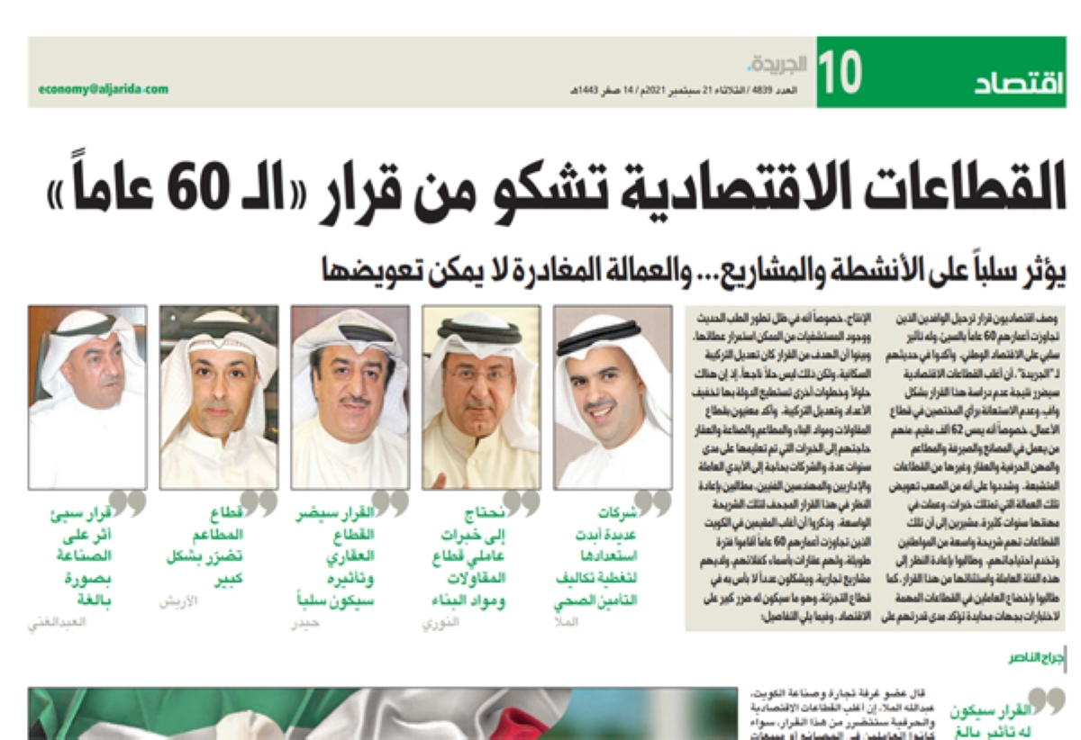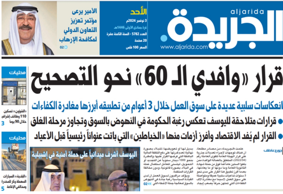 على خلفية حملة شنتها «الجريدة»، آخرها المانشيت الذي نشرته في 3 الجاري بعنوان «قرار وافدي الـ 60 نحو التصحيح»، والذي أشارت خلاله إلى «وجود توجهات لإجراء تعديلات جذرية على قرار الهيئة العامة للقوى العاملة رقم (34/2022)، المتعلق بالعمالة الوافدة ممن بلغوا الستين عاماً فما فوق من حملة شهادة الثانوية العامة وما دونها أو ما يعادلها، بعدما أفرز تطبيقه على مدى 3 سنوات تداعيات سلبية عميقة ومتواصلة على سوق العمل»، علمت «الجريدة» أن مجلس إدارة الهيئة، وافق خلال اجتماعه قبل يومين، على إلغاء القرار السالف، ورفع اقتراح إلغائه إلى رئيس مجلس الوزراء بالإنابة وزير الدفاع وزير الداخلية الشيخ فهد اليوسف، لاعتماد الإلغاء.