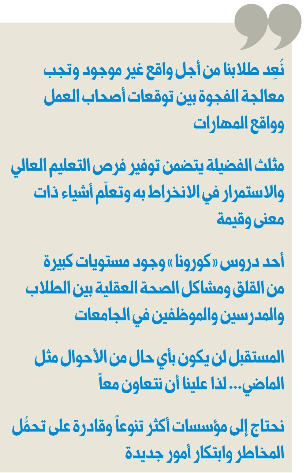 «يجب أن ندرك أن هناك الكثير مما يجب القيام به في مؤسسات التعليم العالي لدينا في إدراك أن الطلاب يتعلمون ليس فقط داخل الفصل ولكن خارجه أيضًا. علينا أن نبتعد عن تلك الفكرة التي تقول أنه لا يمكنك أن تحصل على التعليم إلا من خلال المعلم، هذه فكرة خاطئة. اليوم نحتاج إلى المرونة الحقيقية في عروض التعليم العالي لدينا؛ نحتاج إلى الاستفادة في تقديم التعليم المختلط؛ نحتاج إلى ربط الجامعات بشكلٍ أكثر فاعلية بالمجتمع وبالجامعات؛ وإلى بذل المزيد من الجهد لتمكين الطلاب وتشجيعهم على تعلم المزيد بأنفسهم؛ نحن بحاجة إلى بذل المزيد من الجهد للاستفادة من التكنولوجيا، ولدينا أيضاً فرصة لمراجعة وإدراك أهمية المنهج؛ فالطلاب في مؤسساتنا يتم تدريبهم على الحفظ والتذكر تحضيراً للاختبار الذي سينسونه لاحقًا. يجب علينا أن ندرك أن التجربة التعليمية الحقيقية تساعد الطالب ليس فقط على التذكر، بل أيضاً تحليل وتقييم وخلق المعرفة. علينا أن نحرص على ربط الطلاب مع الواقع من حولهم».