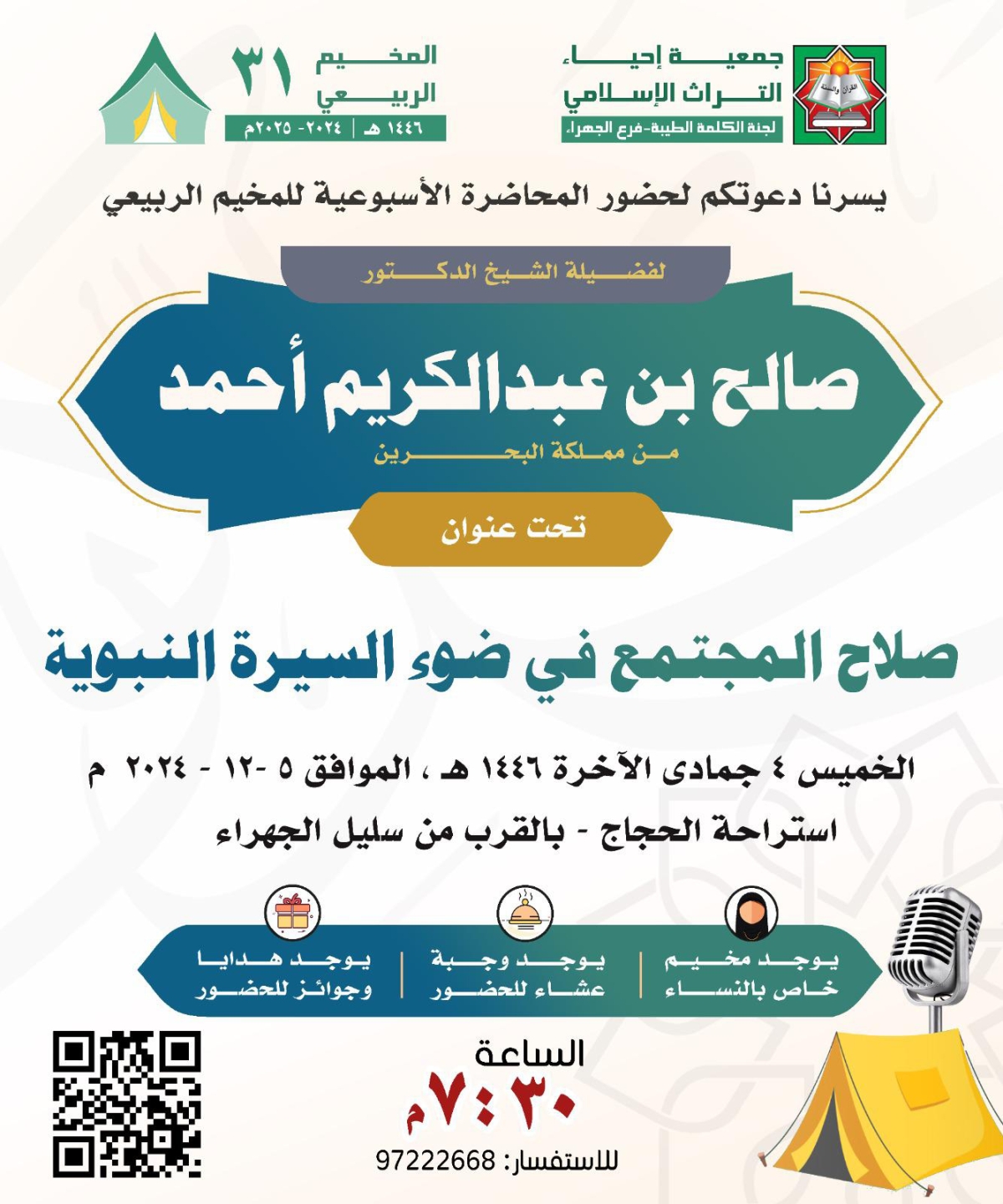 تقيم جمعية إحياء التراث الإسلامي محاضرة عامة حول «صلاح المجتمع في ضوء السيرة النبوية»، يحاضر فيها الشيخ صالح بن عبدالكريم أحمد، مساء الغد الخميس في مخيمها الربيعي 31 الذي تقيمه بمنطقة الجهراء في استراحة الحجاج بالقرب من سليل في الجهراء.