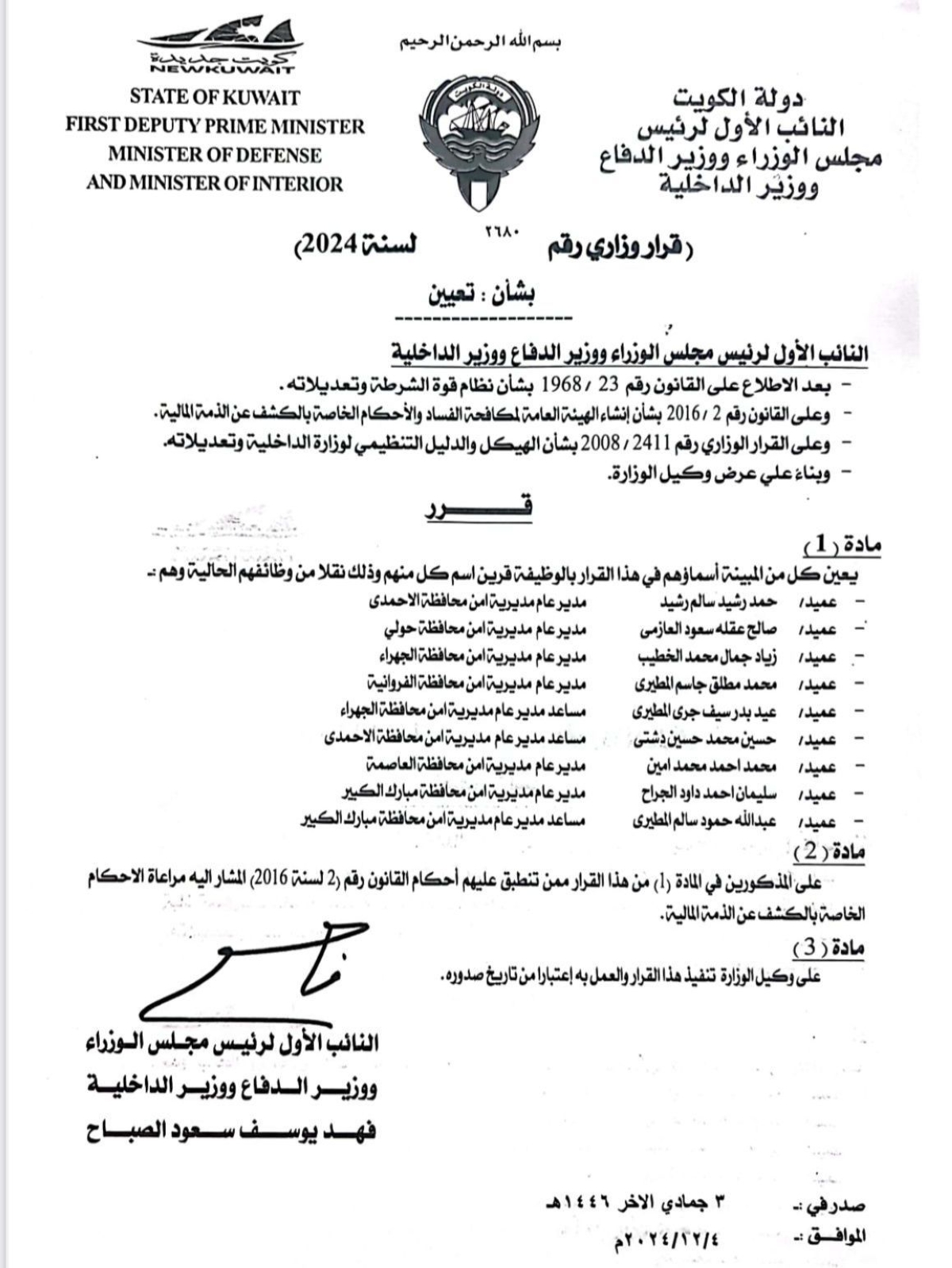 أصدر النائب الأول لرئيس مجلس الوزراء ووزير الدفاع ووزير الداخلية الشيخ فهد اليوسف اليوم قراراً وزرياً يقضي إجراء تدوير لمديري الأمن ومساعديهم في المحافظات، وكانت كالتالي: