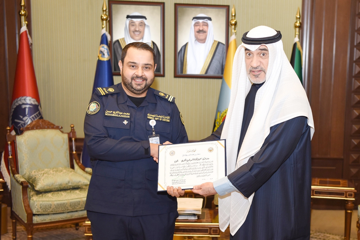 كرم النائب الأول لرئيس مجلس الوزراء وزير الدفاع وزير الداخلية الشيخ فهد اليوسف المفتش الجمركي محمد شمس الدين، تقديراً لجهوده في كشف وضبط محاولة لتهريب شخص بطريقة غير مشروعة.