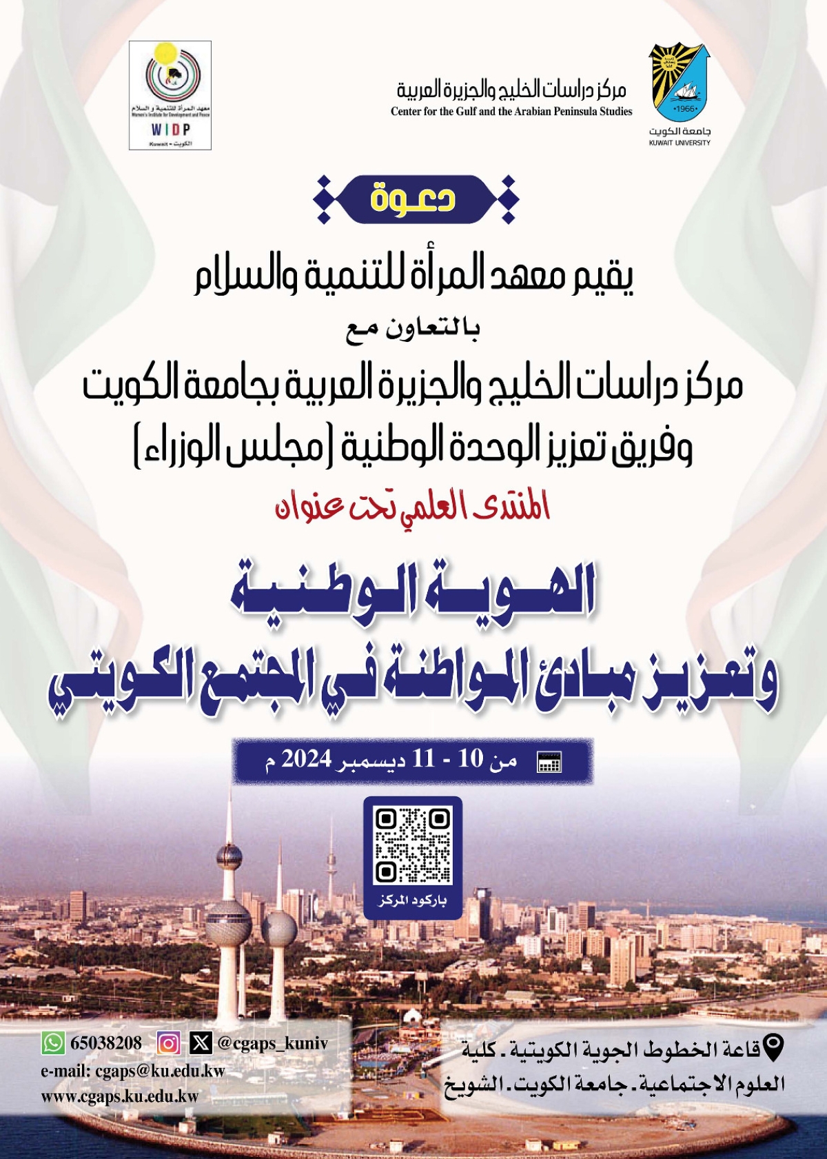 يقيم معهد المرأة للتنمية والسلام، بالتعاون مع مركز دراسات الخليج بجامعة الكويت وفريق تعزيز الوحدة الوطنية، المنتدى العلمي بعنوان «الهوية الوطنية وتعزيز مبادئ المواطنة في المجتمع الكويتي».