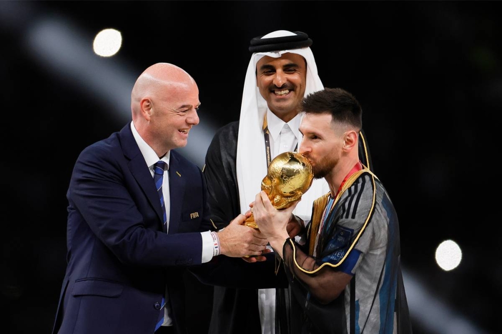 وحمل بعدها ميسي الكأس الغالية بعدما اتشح بالبشت الخليجي (عباءة رجالية يرتديها العرب) التي وضعها على كتفيه أمير قطر الشيخ تميم بن حمد آل ثاني إلى جانب رئيس الاتحاد الدولي لكرة القدم (فيفا) جاني إنفانتينو.