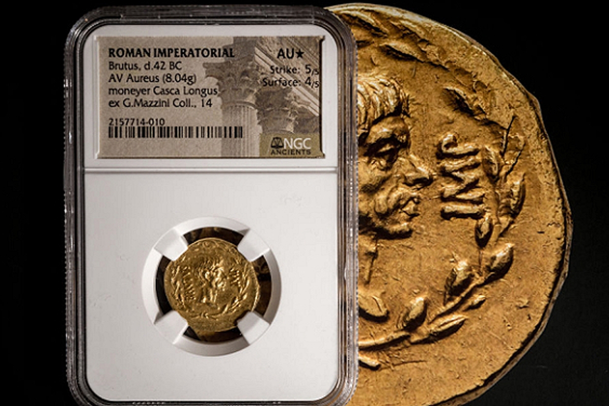 بيعت قطعة نقود ذهبية رومانية نادرة جداً تحمل صورة بروتوس، أحد المشاركين في قتل يوليوس قيصر، مقابل 2.09 مليون دولار، خلال مزاد أقيم أمس في جنيف.