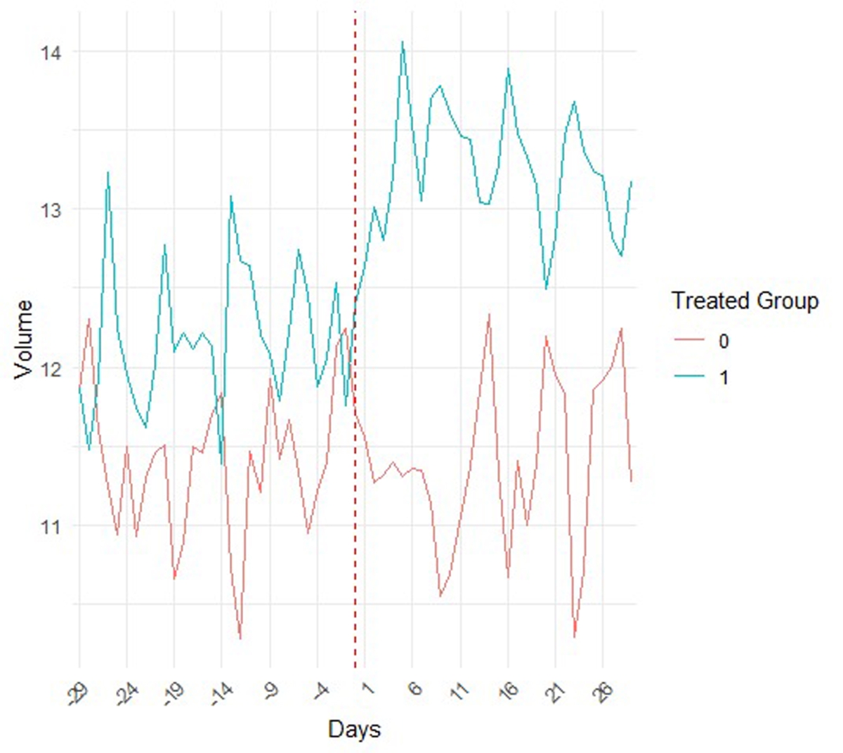 في الأسواق الناشئة، مثل الكويت، يمثل وجود صُناع السوق عاملاً أساسياً لضمان استقرار السوق وتنشيطه، حيث يسهم في جعله أكثر جاذبية للمستثمرين المحليين والدوليين على حد سواء. ولدعم فرضية الدراسة، استخدمنا منهجية علمية تعتمد على الفرق في الفروق (Difference-in-Differences)، حيث قمنا بمقارنة أداء الشركات التي وقَّعت اتفاقيات مع صُناع السوق (المجموعة المعالجة) مع الشركات التي لم توقع مثل هذه الاتفاقيات (المجموعة الضابطة). ويظهر الشكل البياني المرفق الاتجاهات في حجم التداول للشركات المعالجة (باللون الأزرق) والشركات الضابطة (باللون الأحمر)، حيث يُظهر أن الاتجاهات كانت متوازية قبل توقيع الاتفاقيات (اليوم 0)، مما يدعم دقة التحليل ومصداقية النتائج.