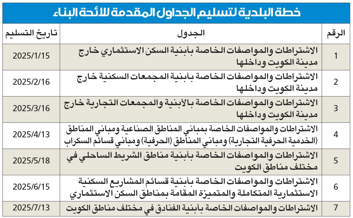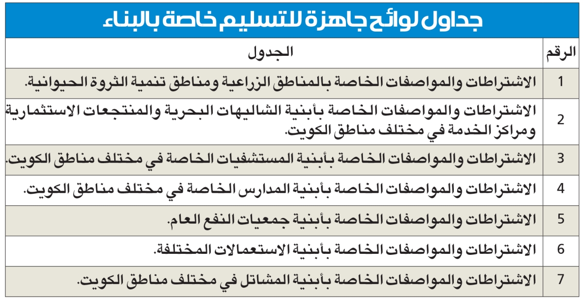 وأقرت اللجنة تعديل نسب البناء في المناطق الزراعية (الوفرة - العبدلي - الصليبية)، لتكون نسبة البناء المسموح بها هي 10 بالمئة من مساحة القسيمة، وبحدّ أقصى 10 آلاف متر مربع، على أن تشمل المباني سكنا واستراحة عائلية لصاحب القسيمة بمساحة إجمالية لا تزيد على 1000 متر مربع، وسكن العمال وغرفة الحارس بمساحة لا تزيد على 2000 متر مربع.
