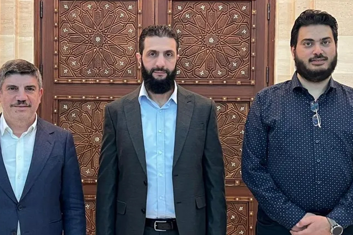 صورة تجمع 3 أشخاص، في الوسط كان أحمد الشرع الملقب بـ«أبو محمد الجولاني» قائد هيئة تحرير الشام السورية.