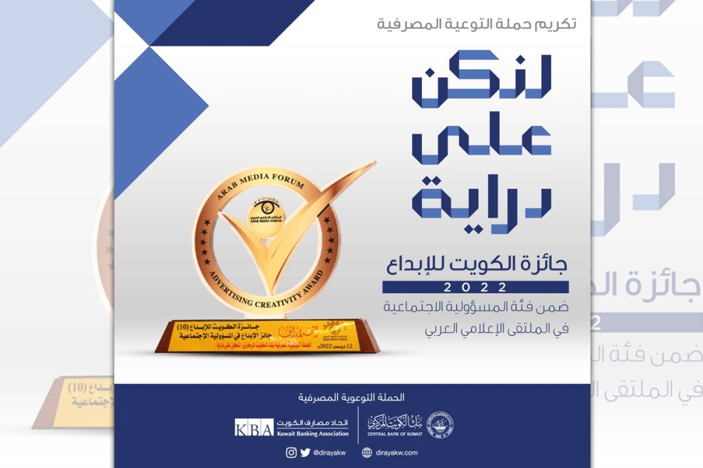 كرمت هيئة جائزة الكويت للإبداع لعام 2022 في حفلها السنوي، الذي أقيم في 12 الجاري، برعاية وزير الإعلام والثقافة، حملة التوعية المصرفية «لنكن على دراية»، التي أطلقها بنك الكويت المركزي، بالتعاون مع اتحاد مصارف الكويت والبنوك الكويتية وجهات أخرى، بهدف تعزيز الثقافة المالية لدى المجتمع ونشر الوعي المصرفي والمالي بجائزة الإبداع في المسؤولية المجتمعية.