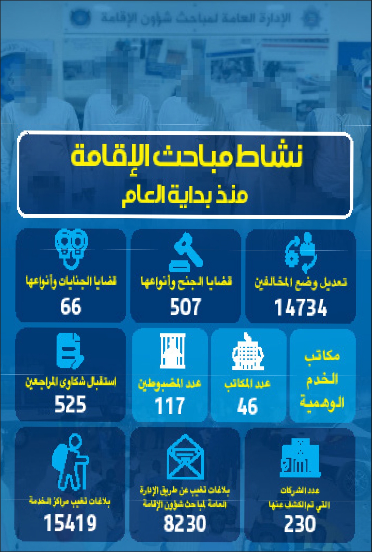 قال العميد الشنفا إنه قبل شهر واحد من انقضاء هذا العام وحتى نهاية شهر نوفمبر، وبعد أشهر مهلة تعديل الأوضاع الثلاثة، شهدت إدارة مباحث شؤون الإقامة في الحالات التي تم إلقاء القبض عليها تعديل أوضاع 14734 مخالفا، مع تسجيل 507 قضايا جنح، و66 جناية، إلى جانب ضبط 46 مكتبا وهميا، بها 117 مخالفا، كما استقبلت الإدارة 525 مراجعا، وكشفت على 230 شركة، كما تلقت من بلاغات التغيب 8230 بلاغا، إلى جانب 15419 لمراكز الخدمة.
