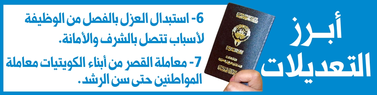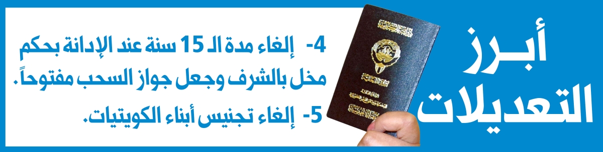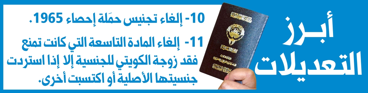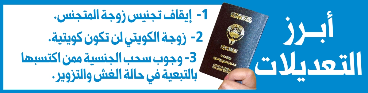 ومن التعديلات التي باتت رسمية، تلك التي طرأت على المادة السابعة من القانون، فبعدما كانت تسمح سابقاً بتجنيس زوجة المتجنس إذا أعلنت رغبتها خلال سنة من تاريخ كسب زوجها الجنسية الكويتية، باتت تمنع ذلك.