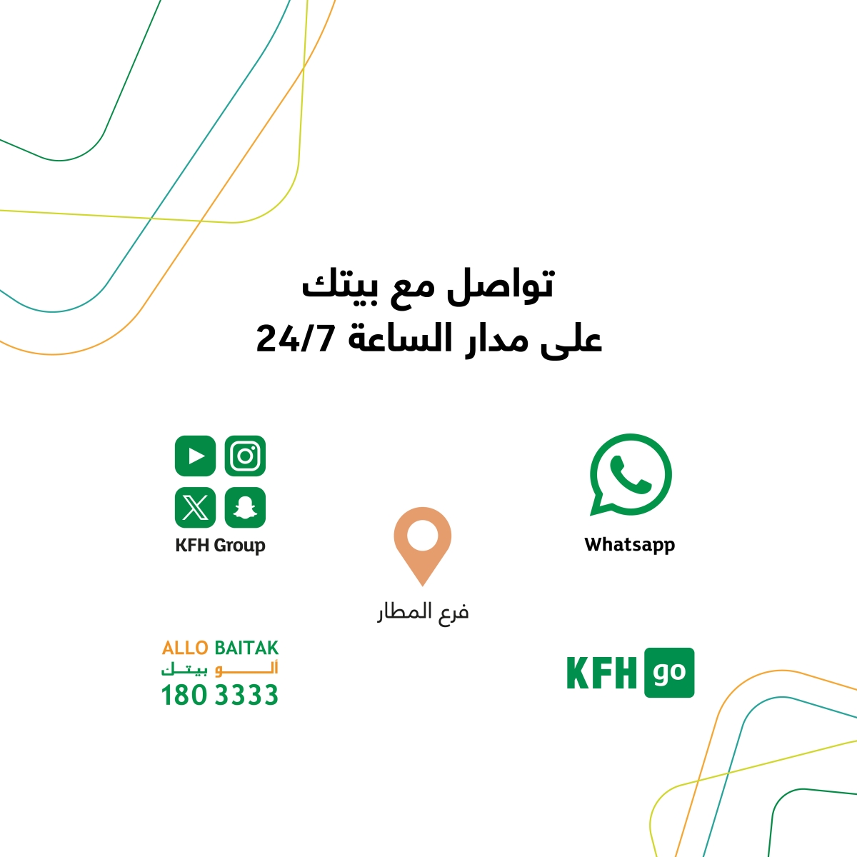 وتتوفر معظم الخدمات المصرفية عبر الموقع الإلكتروني kfh.com، أو عبر تطبيق الموبايل KFH Online، أو من خلال فروع KFH Go الذكية المنتشرة في العديد من المناطق والمواقع المهمة، إضافة إلى قنوات «بيتك» على وسائل التواصل، إلى جانب العديد من قنوات الخدمة الإلكترونية بالاعتماد على أحدث أدوات التكنولوجيا المالية والمنصات الرقمية.